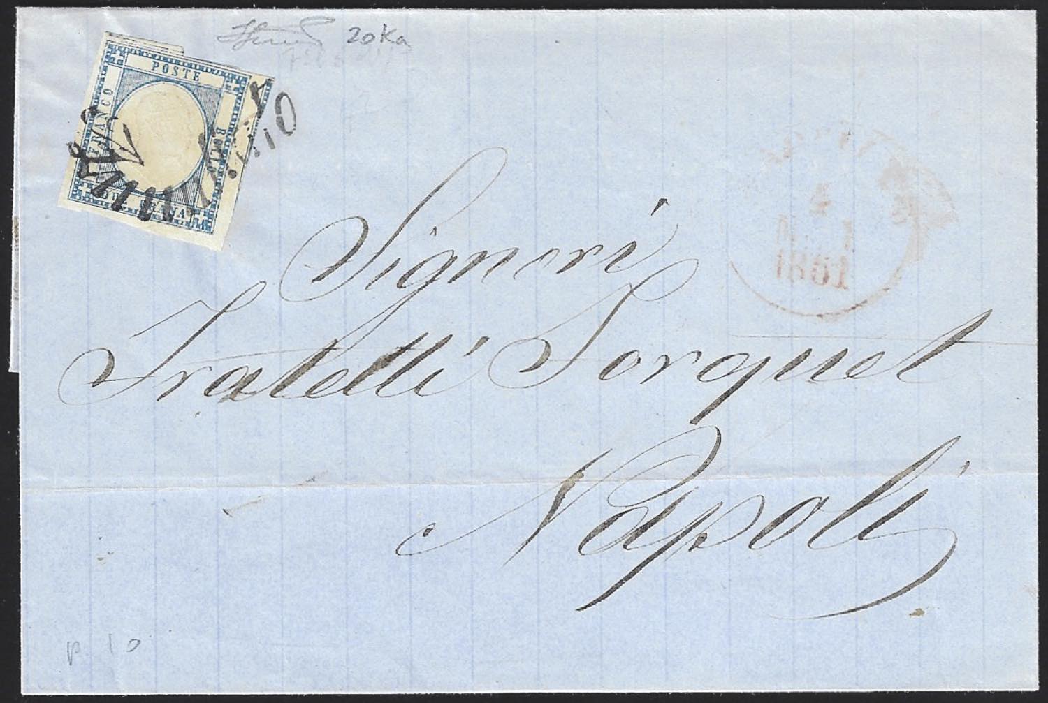 1861 - 2 grana azzurro, doppio filetto di inquadratura in alto (20ka), perfetto, su sovracoperta di lettera da L'Aquila, svolazzo + cerchio rosso, punti 10, a napoli. Rara la varietà così evidente. Ferrario.