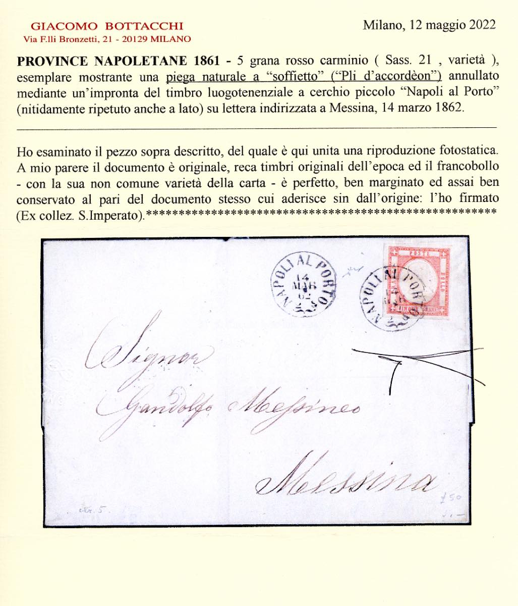 1862 - 5 grana rosso carminio (21), bel pli d'accordeon orizzontale, perfetto e ben marginato, su fresca sopracoperta di lettera da Napoli 14/3/1862 a Messina. Rara varietà su questa emissione, di splendida qualità. Chiavarello, cert. Bottacchi. Ex coll. Imperato.