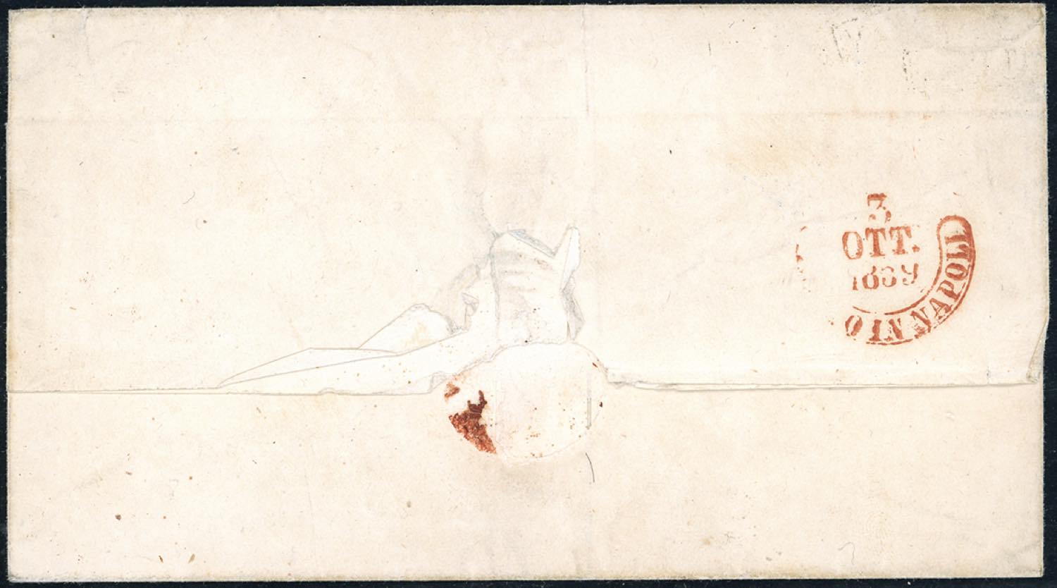 RODI, ovoidale con ornati punti R2 - 2 grana (7b), perfetto su sovracoperta di lettera per Napoli "annullato" e transito di S.Severo 30/9/1859. Splendida e bollo di eccezionale nitidezza. Cert. Bottacchi "la migliore tra le pochissime a tutt'oggi note".