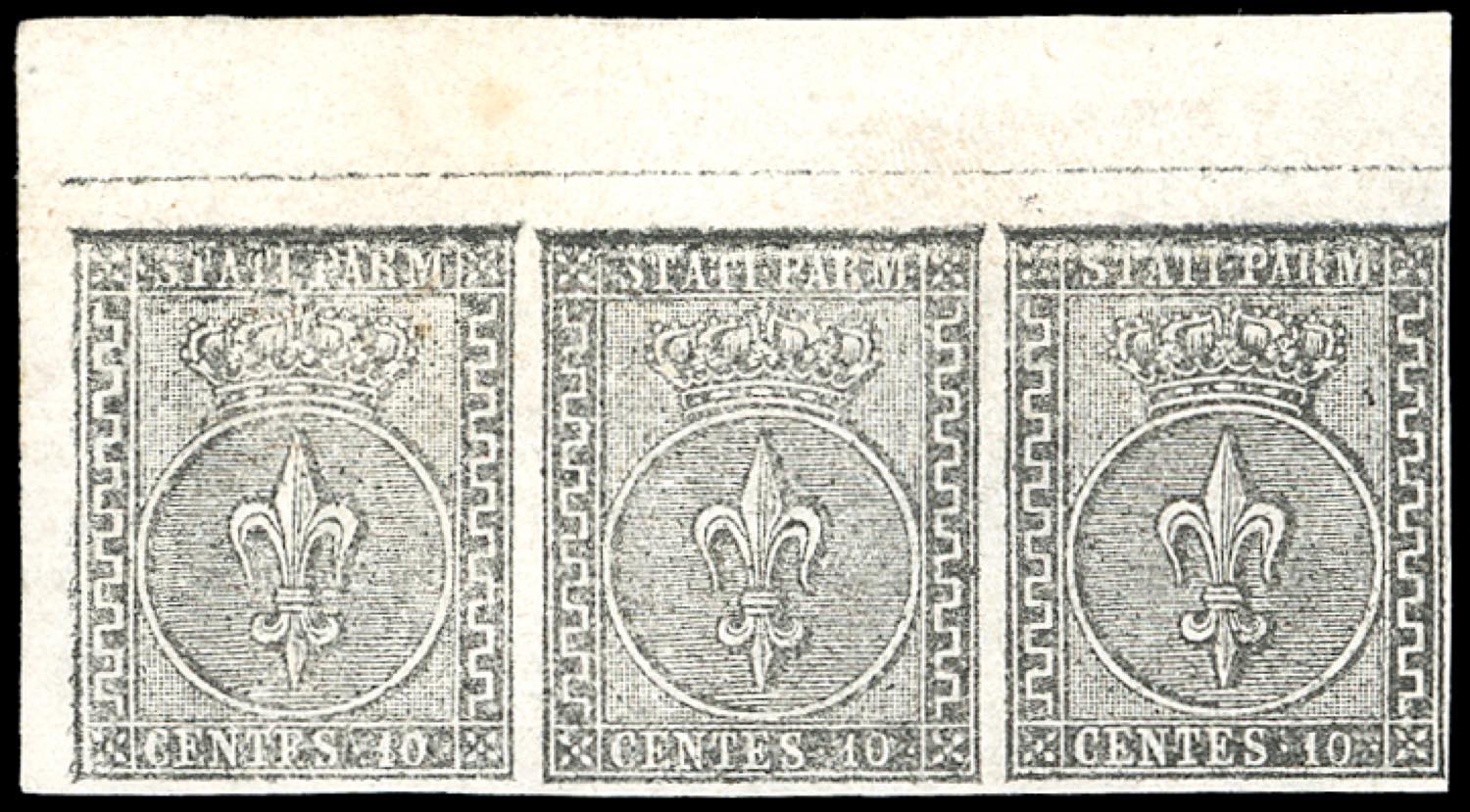 1852 - 10 cent. bianco (2), striscia orizzontale di tre angolo di foglio superiore sinistro, nuova, gomma originale, perfetta. Fiecchi, ... Leggi tutto