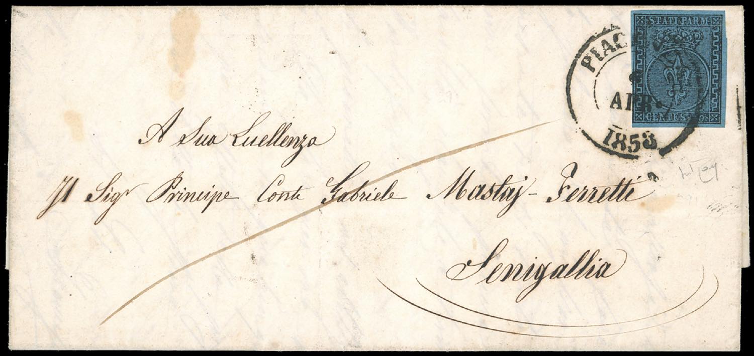 1853 - 40 cent. azzurro (5), perfetto, su fresca lettera da Piacenza 6/4/1853 a Senigallia. Cert. Raybaudi.