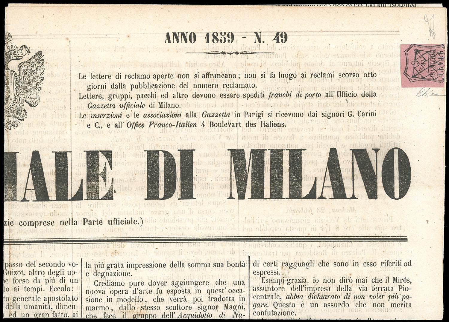SEGNATASSE PER GIORNALI 1859 - 6 cent. rosa vivo (1), corto in alto, annullato con la griglietta di Piacenza, su pagina completa del giornale "Gazzetta Ufficiale di Milano" del 26/2/1859. Raro e molto fresco, occasione. Cert. Diena e Ferrario.
