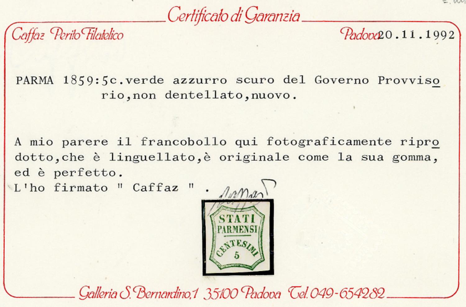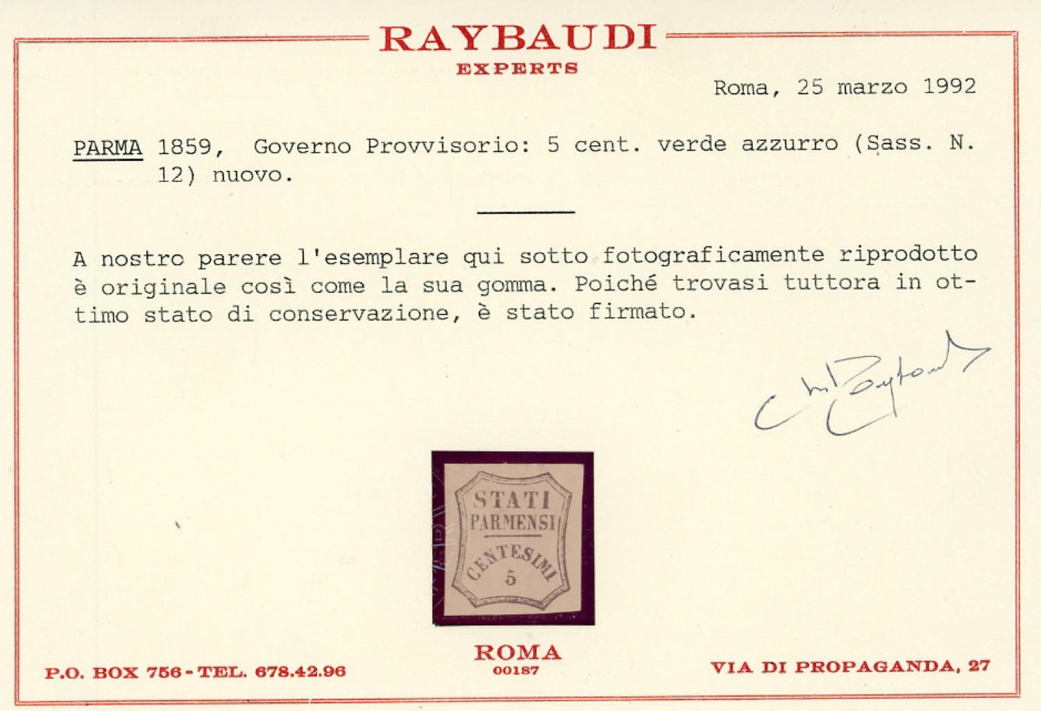 1859 - 5 cent. verde azzurro, I composizione (12), nuovo, gomma originale, perfetto. Emilio Diena, cert. Caffaz. e Raybaudi.