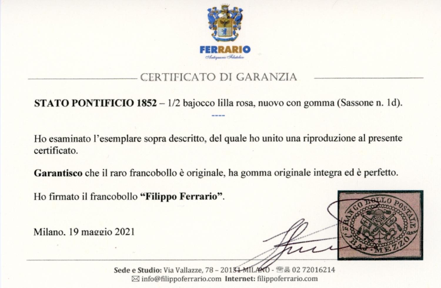 1852 - 1/2 baj lilla rosa (1d), gomma originale integra, perfetto. Raro! Cert. Ferrario.