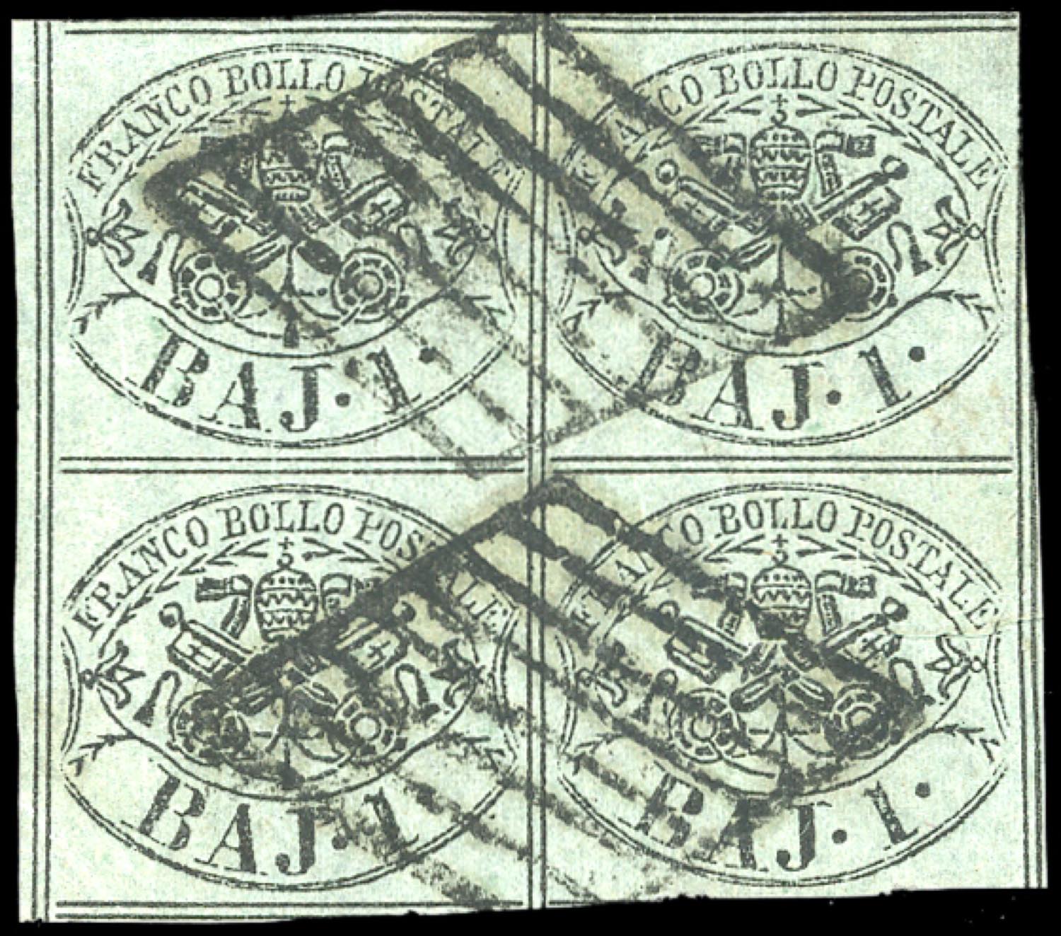 1852 - 1 baj verde grigiastro, blocco di quattro, filigrana di ricucitura al centro (2e), blocco di quattro, usato, perfetto. Raro. Chiavarello. Ex coll. Imperato. (cat. Sassone € 2.500 per il solo blocco di quattro, senza varietà)