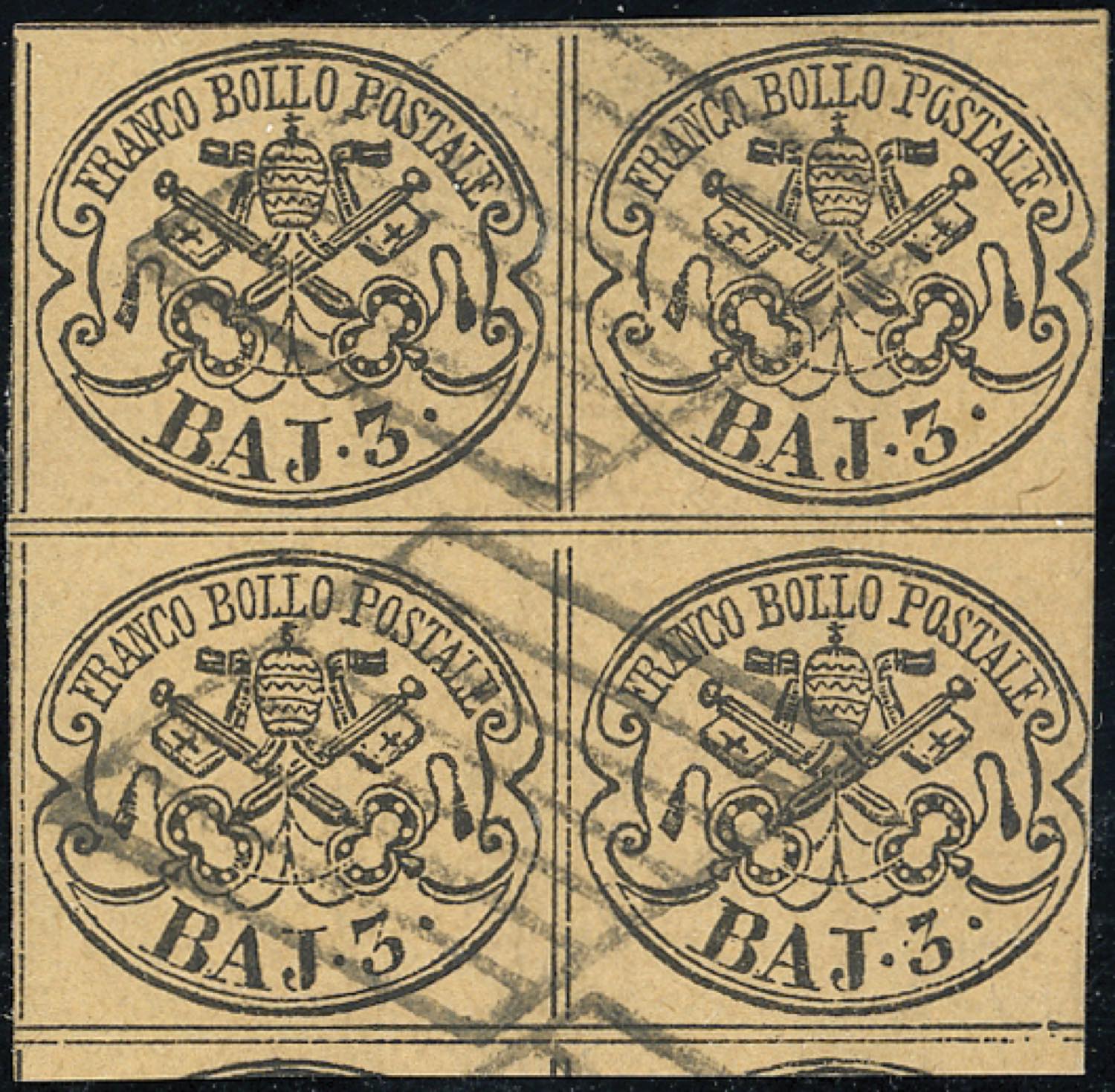 1852 - 3 baj camoscio (4c), blocco di quattro, usato, perfetto, un esemplare con un margine a filo ma completo. Non comune. A.Diena, Chiavarello, cert. Ferrario. Ex coll. Imperato.