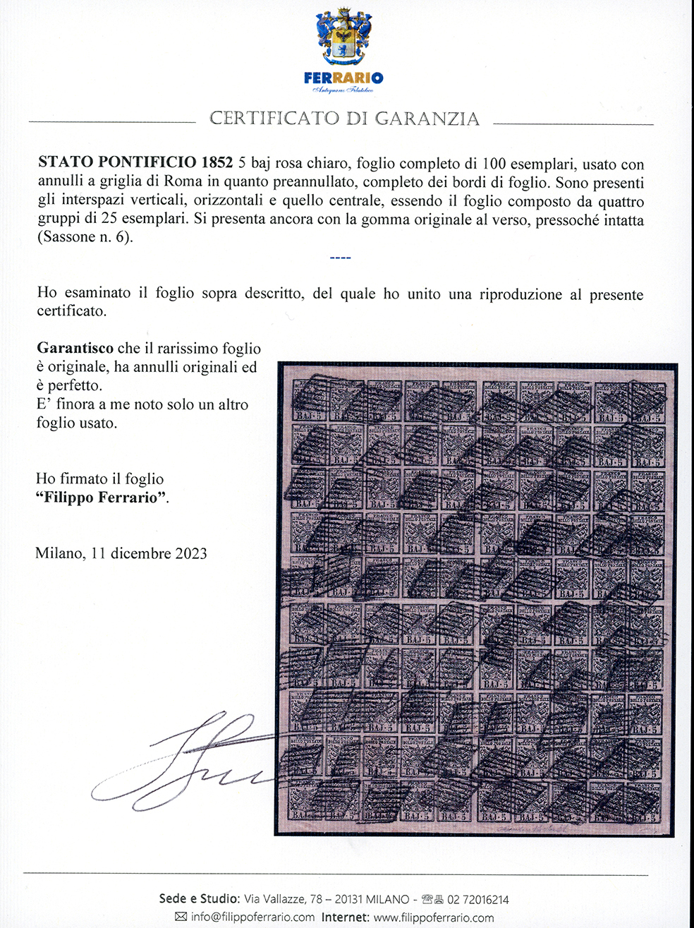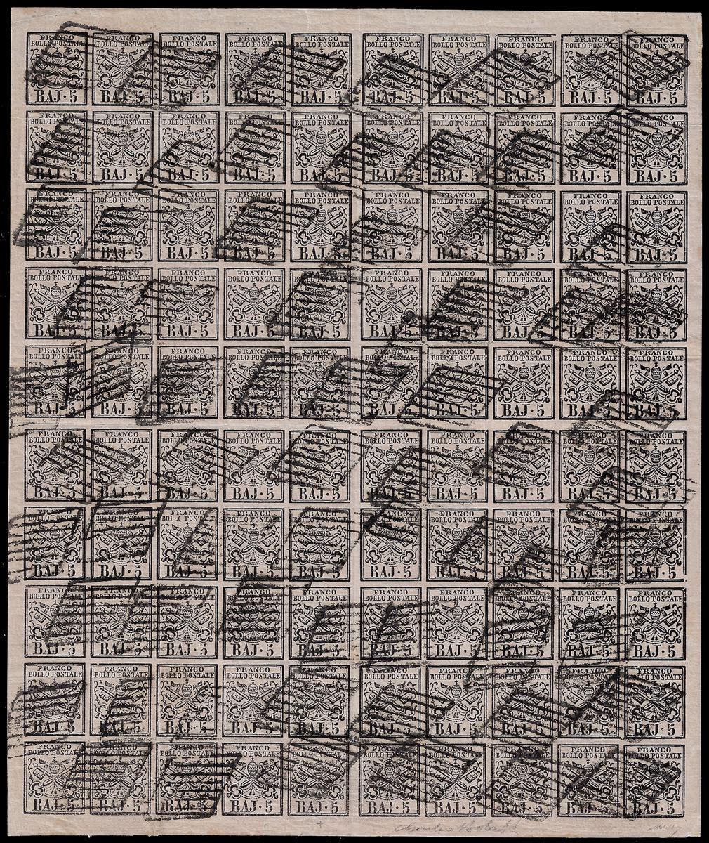 1852 - 5 baj rosa chiaro (6), foglio completo di 100 esemplari, usato con annulli a griglia di Roma in quanto preannullato, perfetto, completo dei bordi di foglio. Sono presenti gli interspazi verticali, orizzontali e quello centrale, essendo il foglio composto da quattro gruppi di 25 esemplari. Si presenta ancora con la gomma originale al verso, pressochè intatta. A noi risulta finora noto solo un altro foglio usato. Insieme eccezionale, di grande impatto visivo. Rarità dello Stato Pontificio. Firmato Giulio ed Alberto Bolaffi, Emilio ed Alberto Diena, cert. Ferrario.