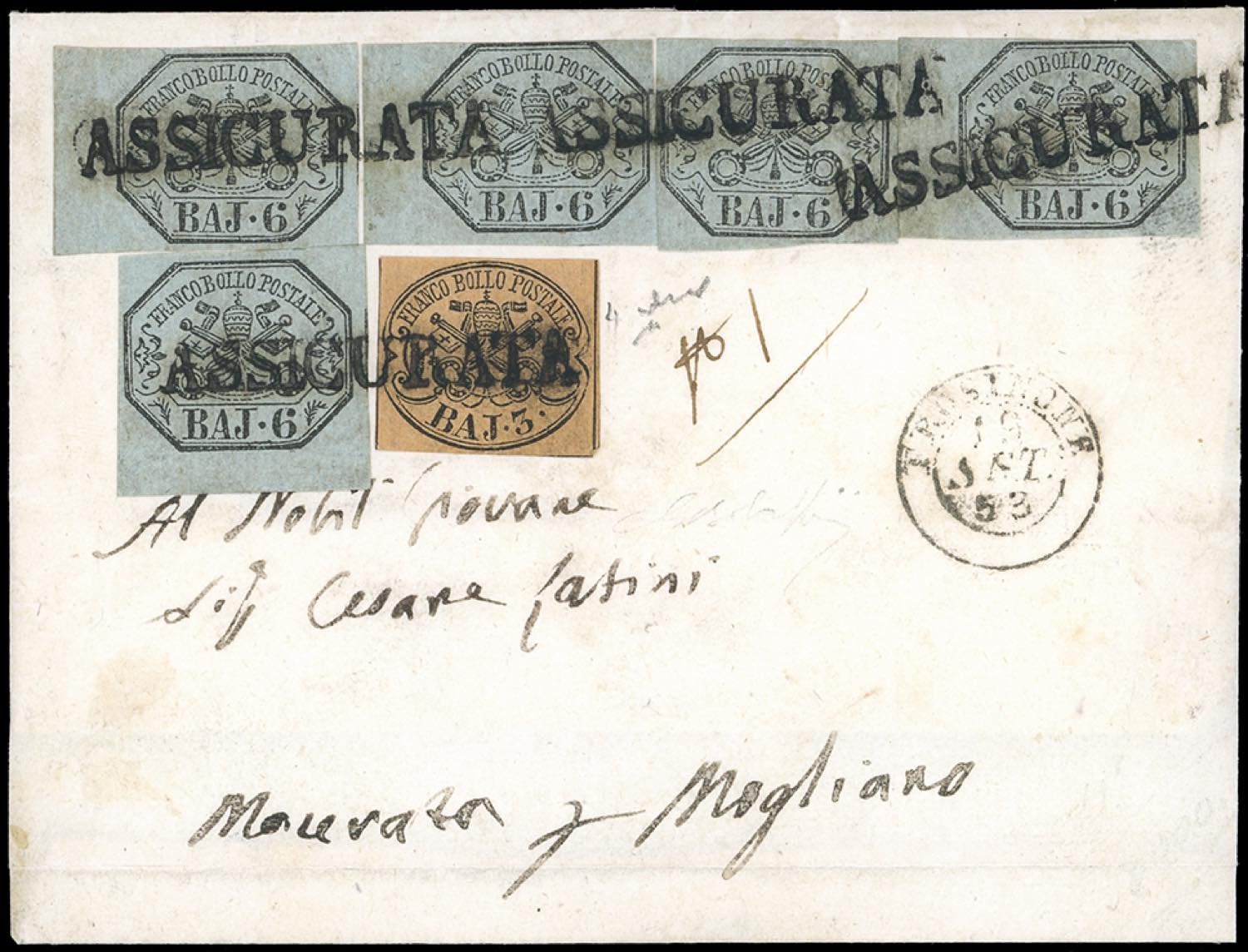1853 - 6 baj grigio azzurrastro, cinque esemplari, 3 baj bistro arancio (7b,4), su fresca lettera assicurata da Frosinone 19/9/1853, lineare "assicurato" unico annullatore (punti 13), a Mogliano. Splendida e rara. G.Bolaffi, Chiavarello. Ex coll. Imperato.