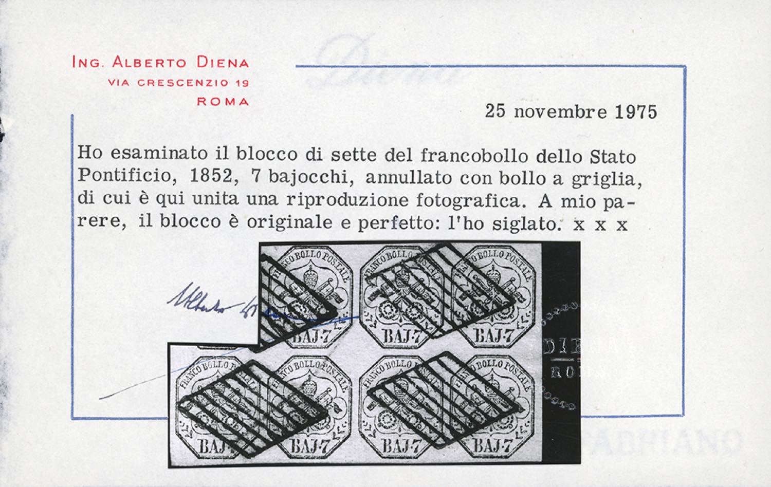1852 - 7 baj azzurro (8), blocco di sette esemplari, perfetto, usato con bollo a griglia e tratto di penna. Splendido e molto fresco. G.Oliva, Fiecchi, L.Raybaudi, Ferrario, cert. A.Diena. Ex coll. Imperato.