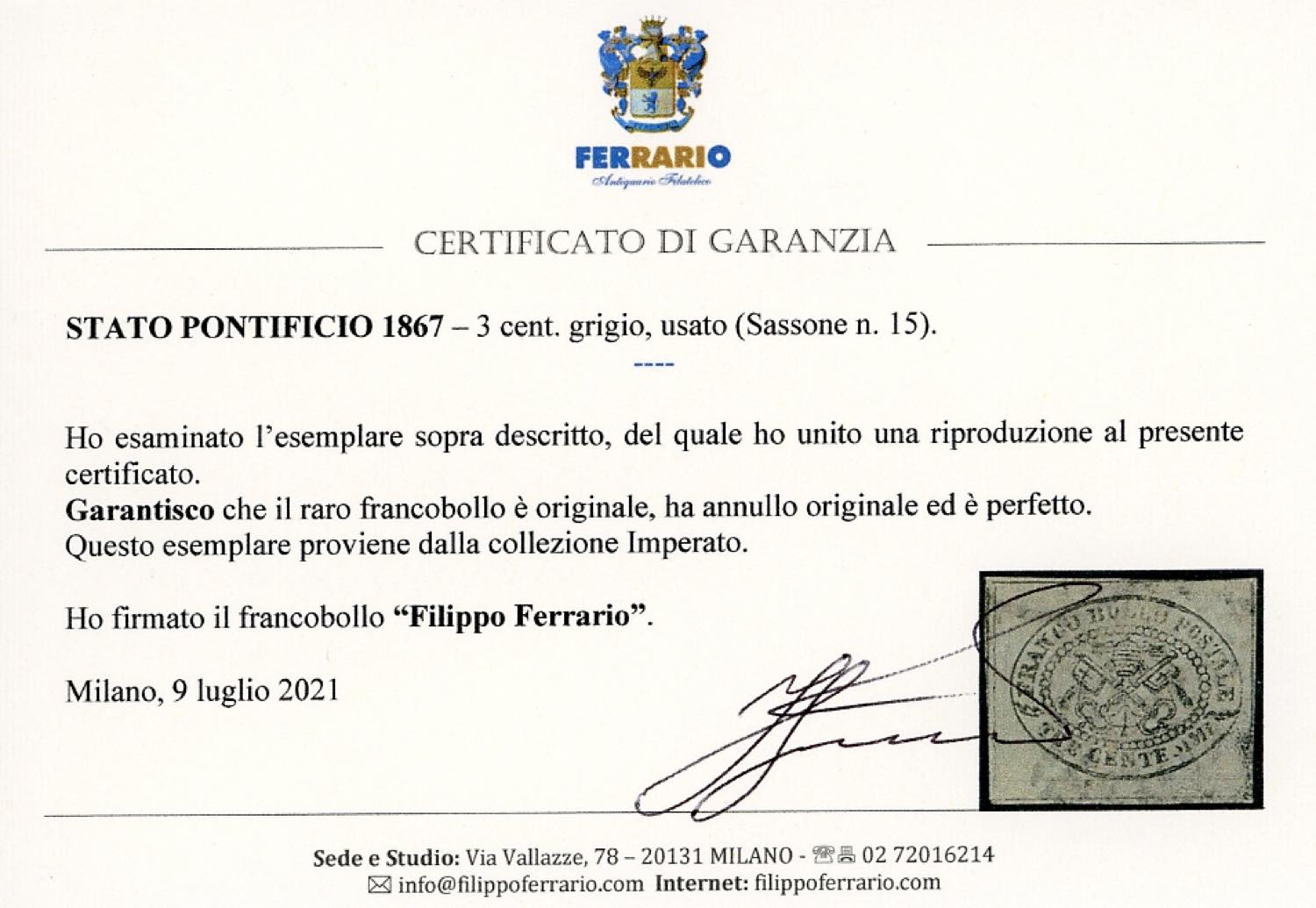 1867 - 3 cent. grigio (15), usato, perfetto. Splendido e raro. Grioni, Em., A., ed E.Diena, G.Oliva, cert. Ferrario. Ex coll. Imperato.