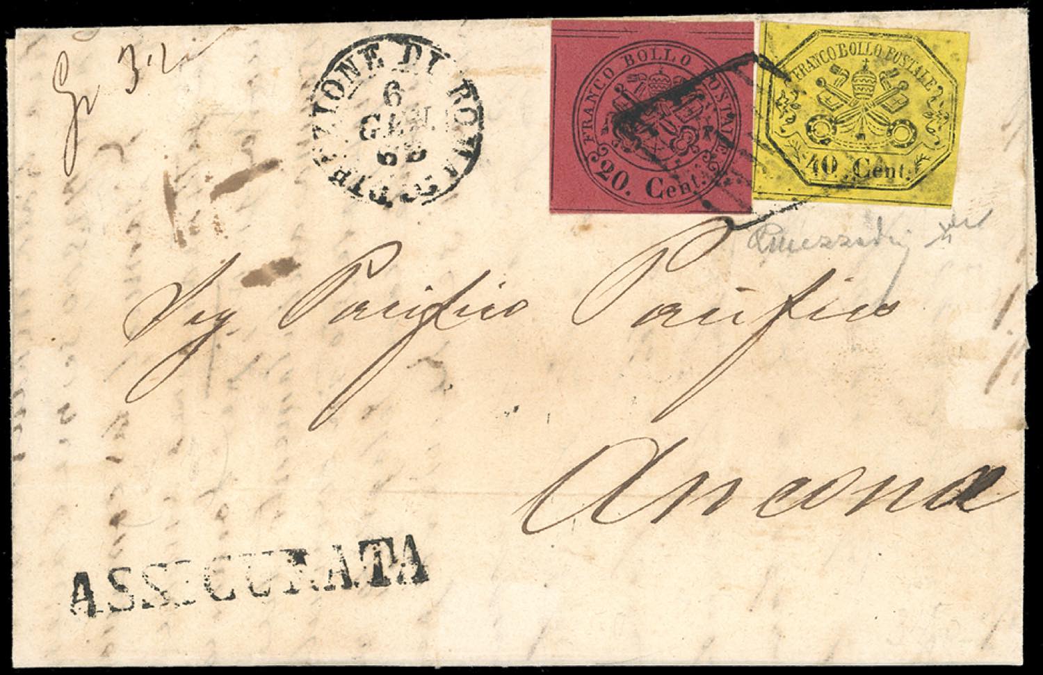 1868 - 20 cent. rosso bruno, 40 cent. giallo (18,19), perfetti, su lettera assicurata da Roma 6/1/1868 ad Ancona. Non comune. Mezzadri, Chiavarello. Ex coll. Imperato.
