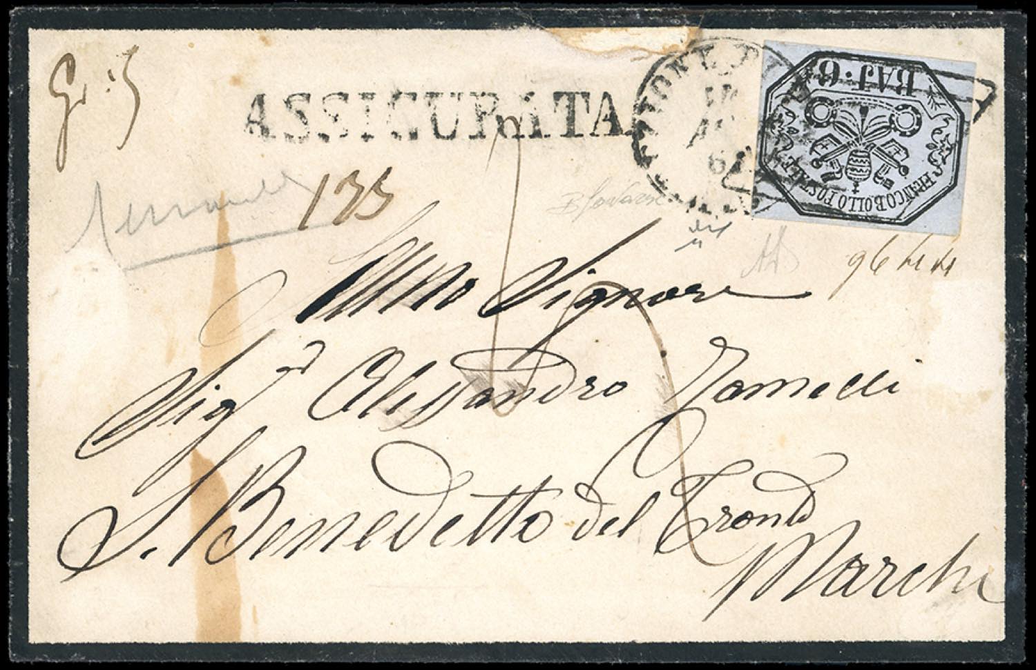 ROMA, Dir + griglia coannullatori non catalogato - 6 baj lilla azzurrastro (7Ab), perfetto, su busta assicurata del 14/4/1867 per San Benedetto del Tronto, tassata. Combinazione di annulli inedita. A.Diena, Chiavarello. Ex coll. Imperato.