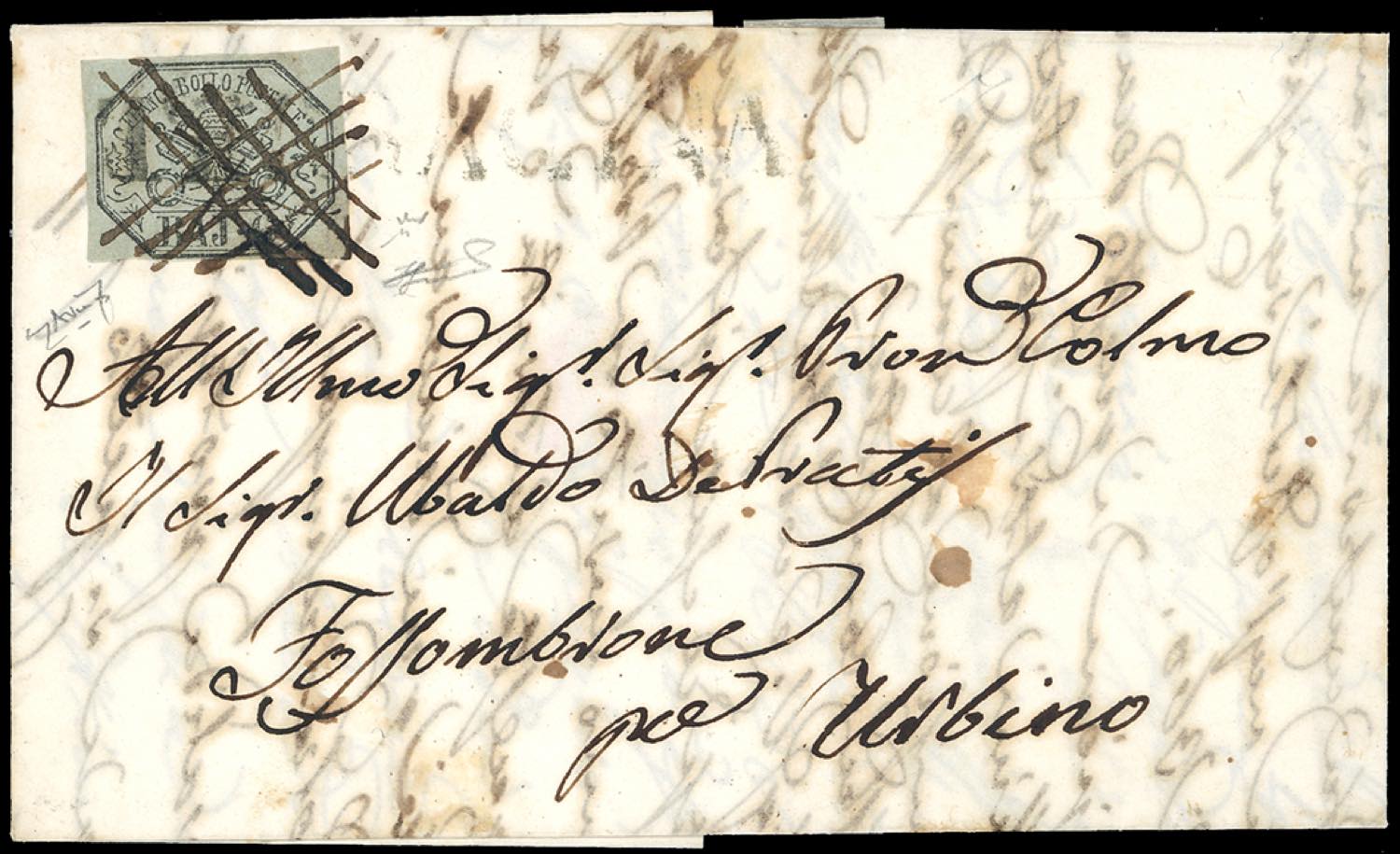 TERRACINA, SD + penna punti 10 (Sass.prossima edizione) - 6 baj (7b), perfetto, su lettera del 5/10/1853 a Fossombrone. Combinazione di annulli inedita e pregevole tariffa, raro insieme. Ferrario, cert. Avanzo. Ex coll. Imperato.