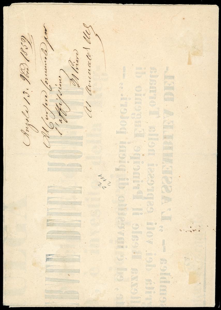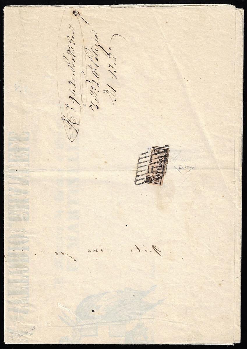 1859 - 8 baj rosa, frazionato a metà (8), ampi margini, lievissima piega orizzontale, su manifesto completo, spedito da Bologna 8/11/1859 ad Anzola. Dei pochissimi casi noti di questo frazionamento questo è l'UNICO NOTO USATO SU MANIFESTO. Grande rarità delle Romagne! Em.Diena, cert. Enzo Diena, Ferrario.