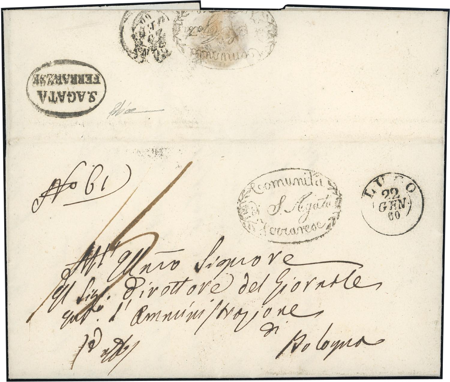 S.AGATA FERRARESE, punti R3 - Lettera non affrancata del 21/1/1860 per Bologna, transito di Lugo sul fronte, tassata 15 centesimi. Si tratta probabilmente dell'ultima data nota di questo rarissimo bollo, che nel gennaio 1860 passò alla provincia di Ravenna cambiando nome. R.Diena.
