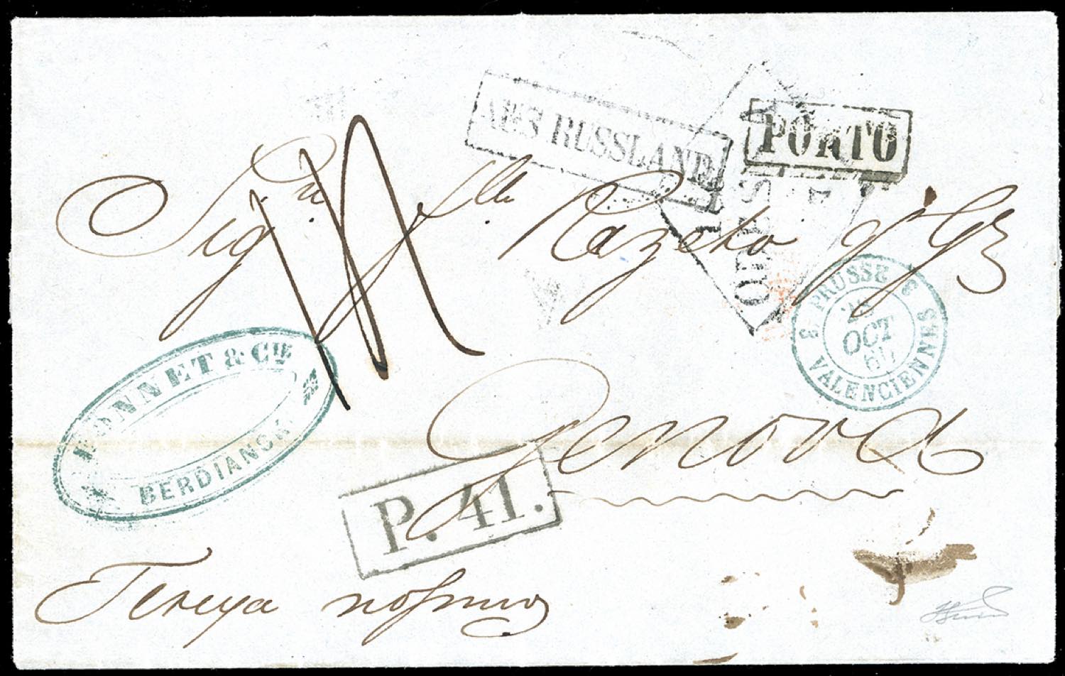 1860 - INCOMING MAIL IMPERO RUSSO UCRAINA - Lettera non affrancata da Berdiansk 15/10/1860, a Genova, tassata 1,40 lire, sul fronte bollo in cartella "P41" prussiano per addebitare alla Francia 80 cent. Ferrario. Ex coll. Imperato.