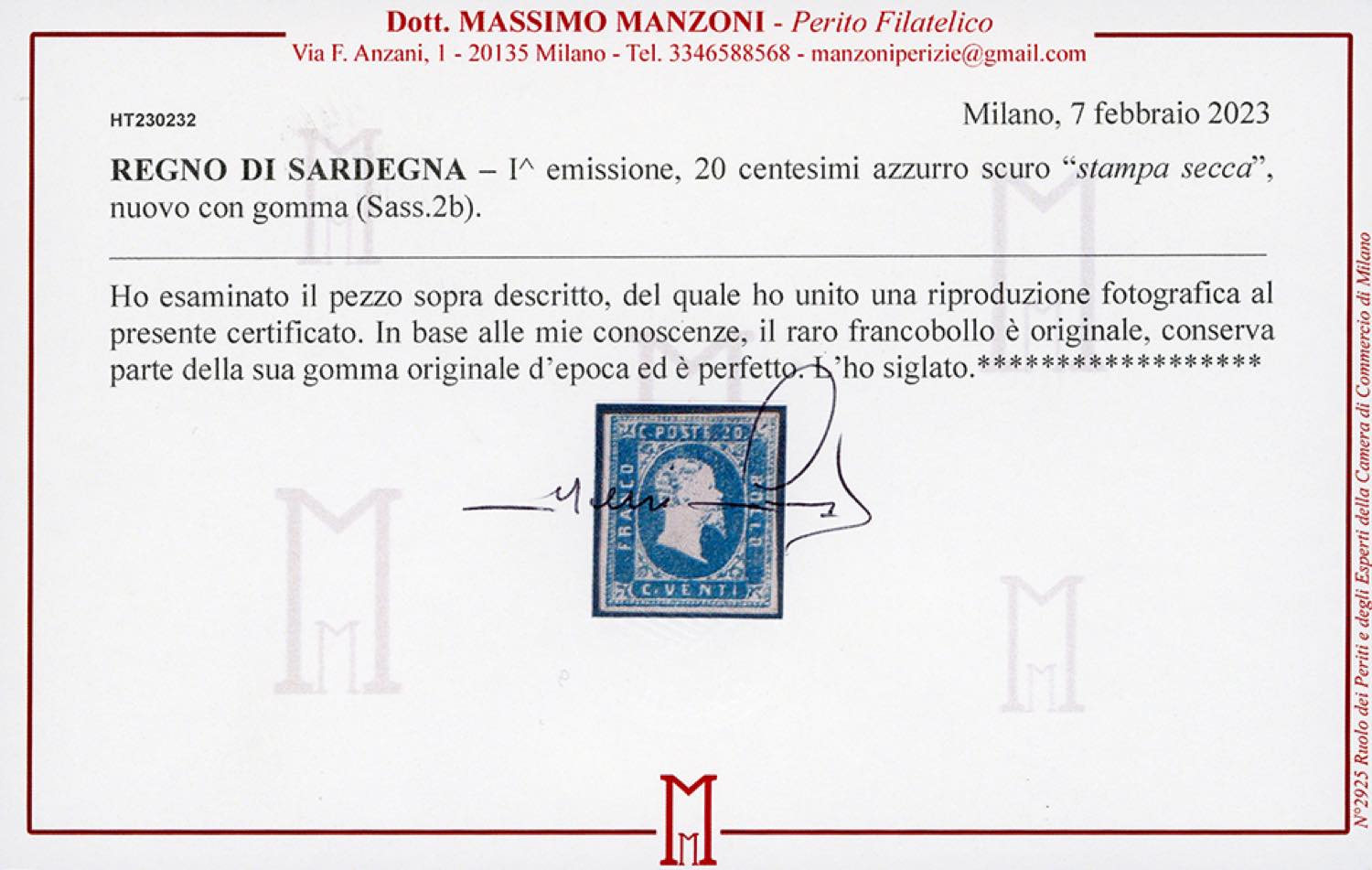 Lotto 382 - 1851 - 20 cent. azzurro scuro, stampa secca (2b), nuovo, ...