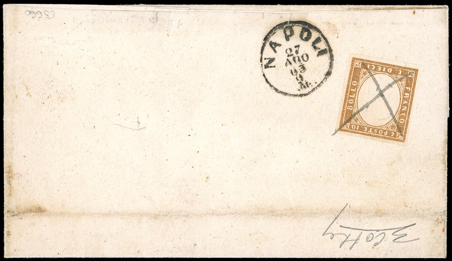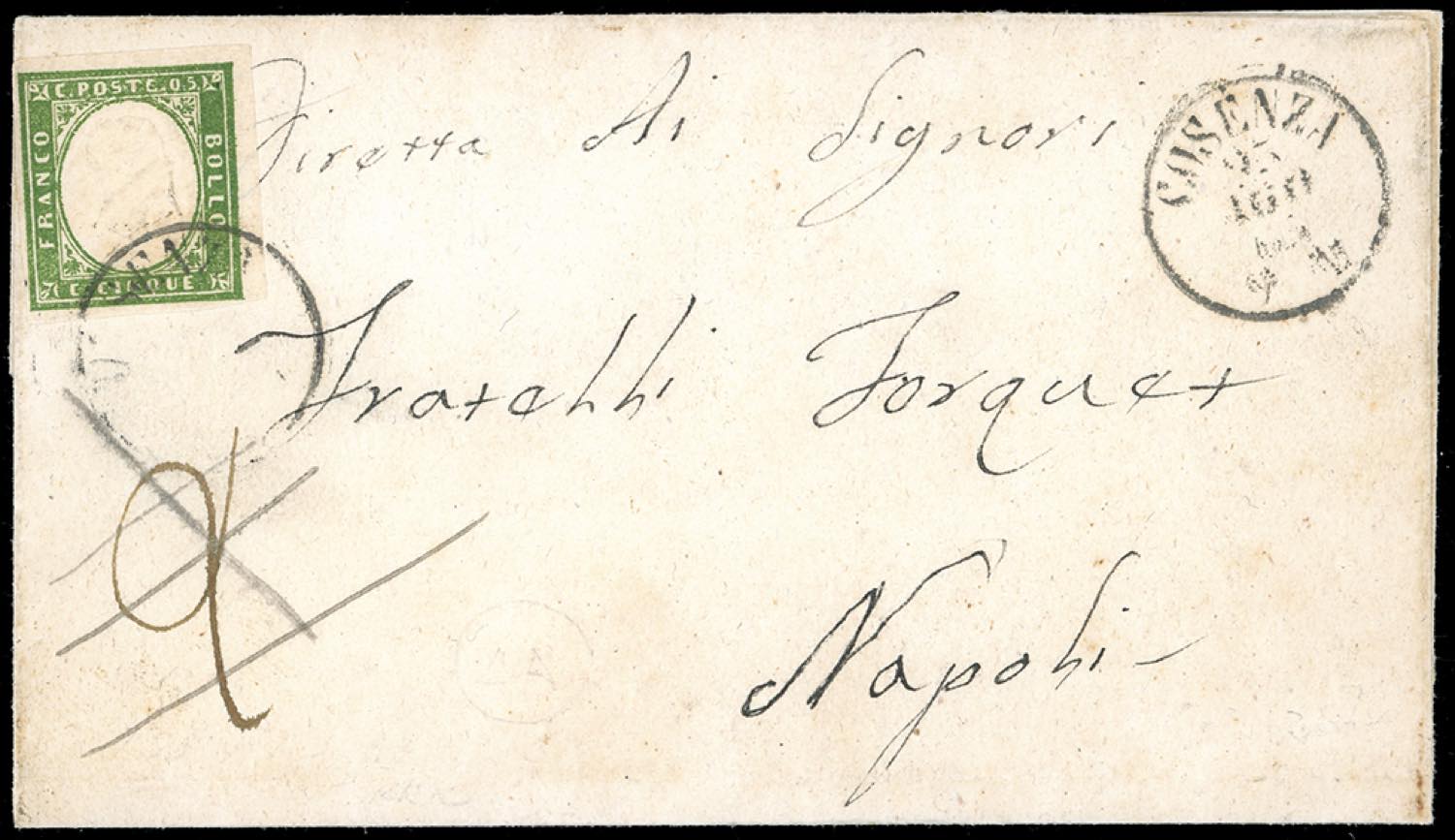 1863 - 5 cent. verde e, al verso, 10 cent. bistro (13Ea,14), perfetti, su fresca lettera da Cosenza 23/8/1863 a Napoli. Il francobollo da 10 cent., applicato al verso, non venne inizialmente notato e la lettera venne tassata 20 cent. Accortisi della sua presenza, la tassa venne cassata ed il francobollo fu annullato con tratti di penna. Molto interessante, combinazione di annulli UNICA NOTA e non catalogata. Dettagliato cert. Colla. Ex coll. Imperato.