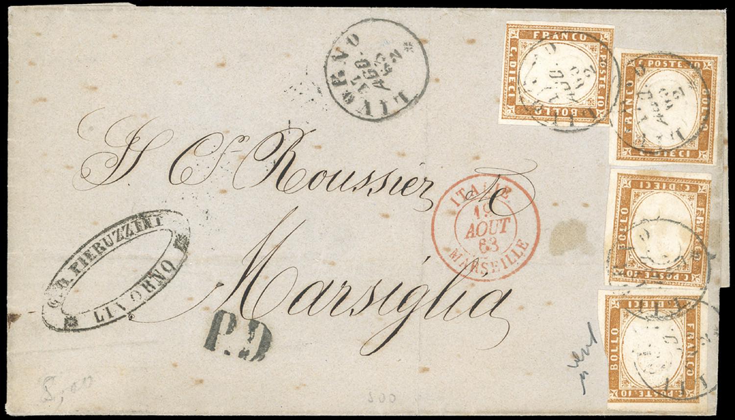 1863 - 10 cent. bistro chiaro (14Ea), quattro esemplari, difetti di marginatura, su lettera da Livorno 17/8/1863 a Marsiglia. Pregevole affrancatura multipla. Chiavarello. Ex coll. Imperato.