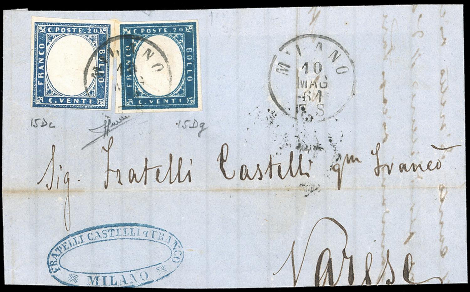 1862 - 20 cent. cobalto verdastro, 20 cent. azzurro oltremare (15Dg,15Dc), perfetti, su frontespizio di lettera da Milano 10/5/1861 a Varese. Bella affrancatura di valori gemelli, di tinte notevolmente differenti. Cert. Sorani (cat. € 15.000++ come lettera).
