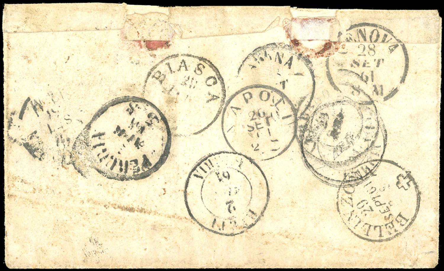 1861 - 40 cent. rosso carminio (16D), due margini leggermente intaccati, su lettera da Torino 30/3/1861 ad Aquila, frazione di Blenio, in Svizzera. La lettera venne inizialmente instradata per errore verso l'omonimo capoluogo dell'Abruzzo e solo sei mesi dopo venne finalmente recapitata in Svizzera, come testimoniato da numerosi bolli di transito al verso. Interessante e raro caso di lettera maldiretta. Ferrario. Ex coll. Imperato.