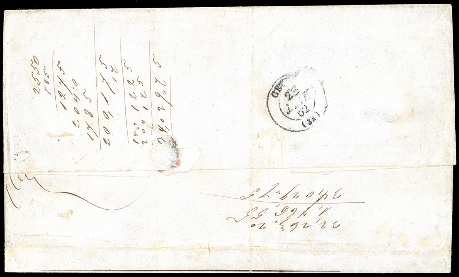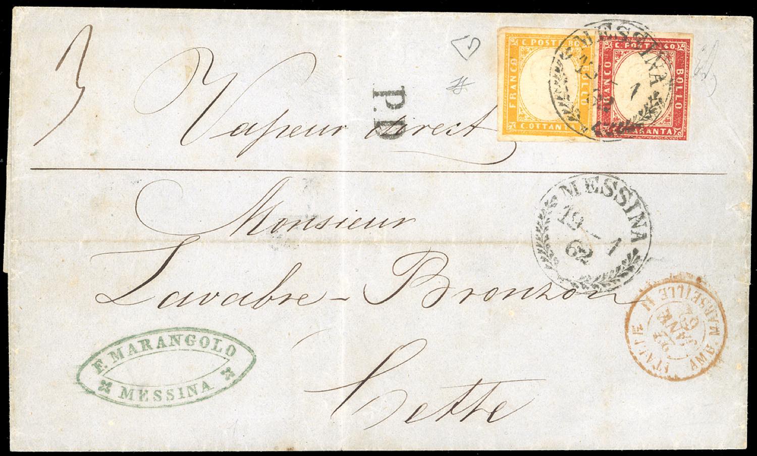 1862 - 80 cent. giallo arancio, perfetto e ben marginato, 40 cent. rosso carminio, leggermente intaccato in basso (17C,16D), su lettera di tre porti da Messina 19/1/1862, cerchio con palme annullatore, a Cette, in Francia. Emilio ed Enzo Diena, cert. Ferrario. Ex coll. Imperato.