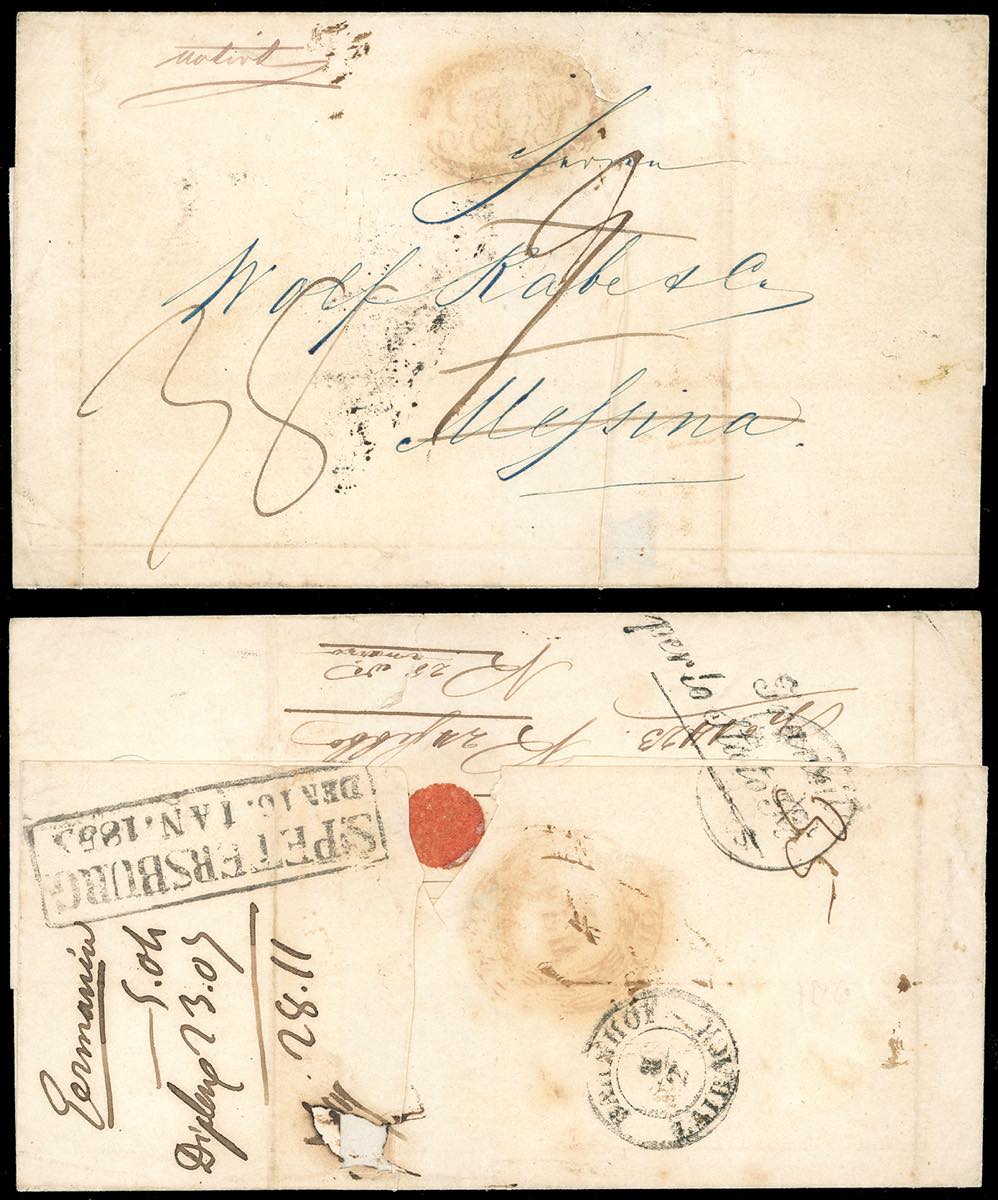 1853 - INCOMING MAIL IMPERO RUSSO - Lettera perfilatelica da San Pietroburgo 16/1/1853 a Messina, porto pagato fino al confine austriaco di 4 copechi, tassata in arrivo 38 grana. Al verso sono presenti i bolli di transito di Laibach e dello Stato Pontificio. Ex coll. Mentaschi.