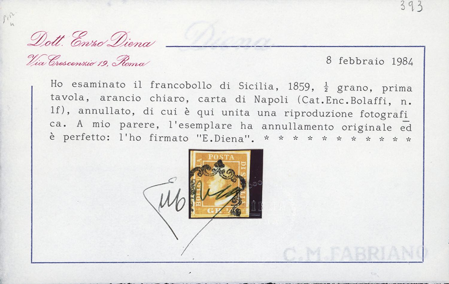 1859 - 1/2 grano giallo arancio chiaro, I tavola, carta di Napoli (1aa), usato, perfetto. Splendido! A.Diena, Chiavarello, cert. Enzo Diena, Ferrario. Ex coll. Imperato.