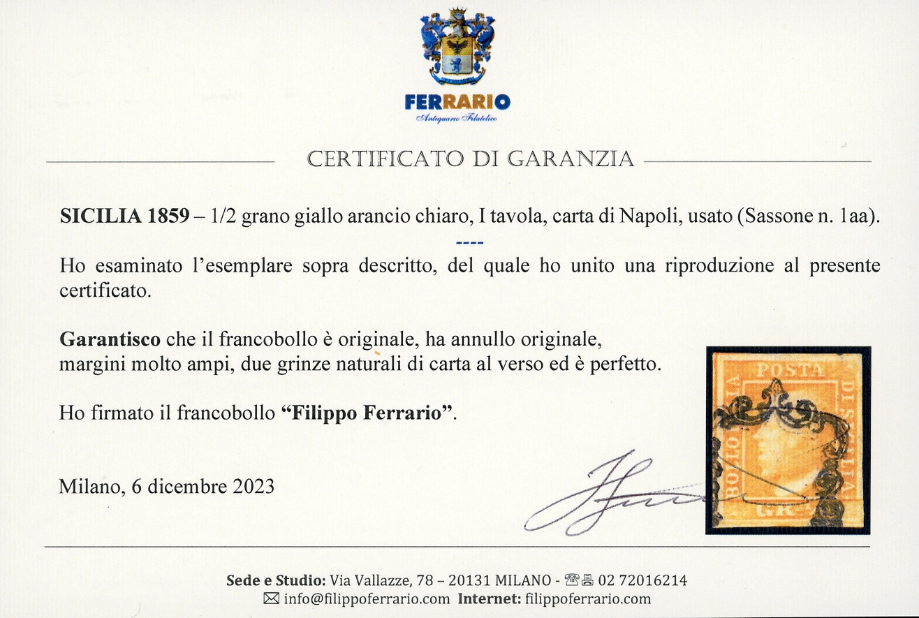 1859 - 1/2 grano giallo arancio chiaro, I tavola, carta di Napoli, ritocco posiz. 99 (1aa), usato, perfetto. Raro, margini molto ampi, due grinze naturali di carta al verso. Chiavarello, cert. Ferrario. Ex coll. Imperato.