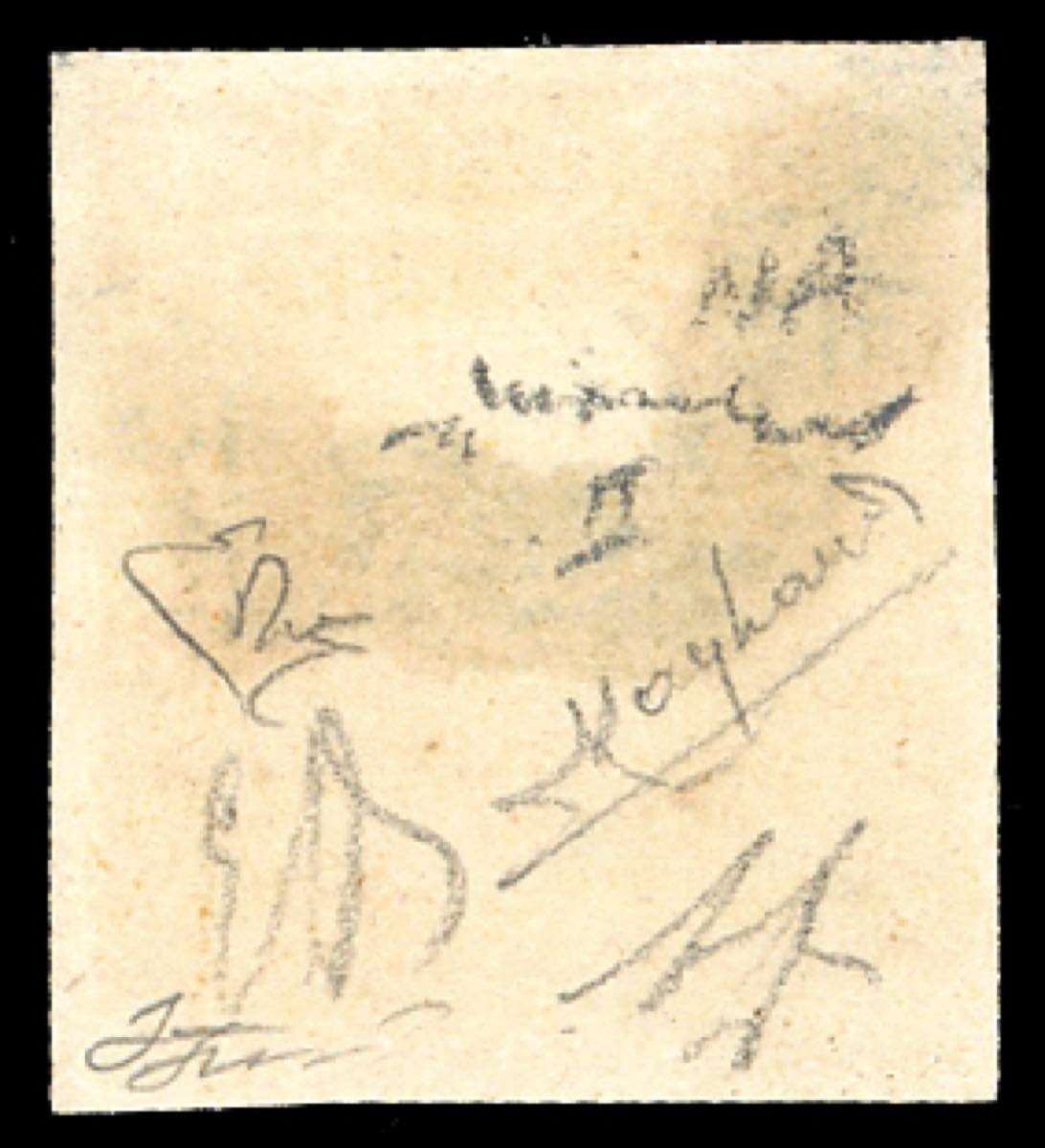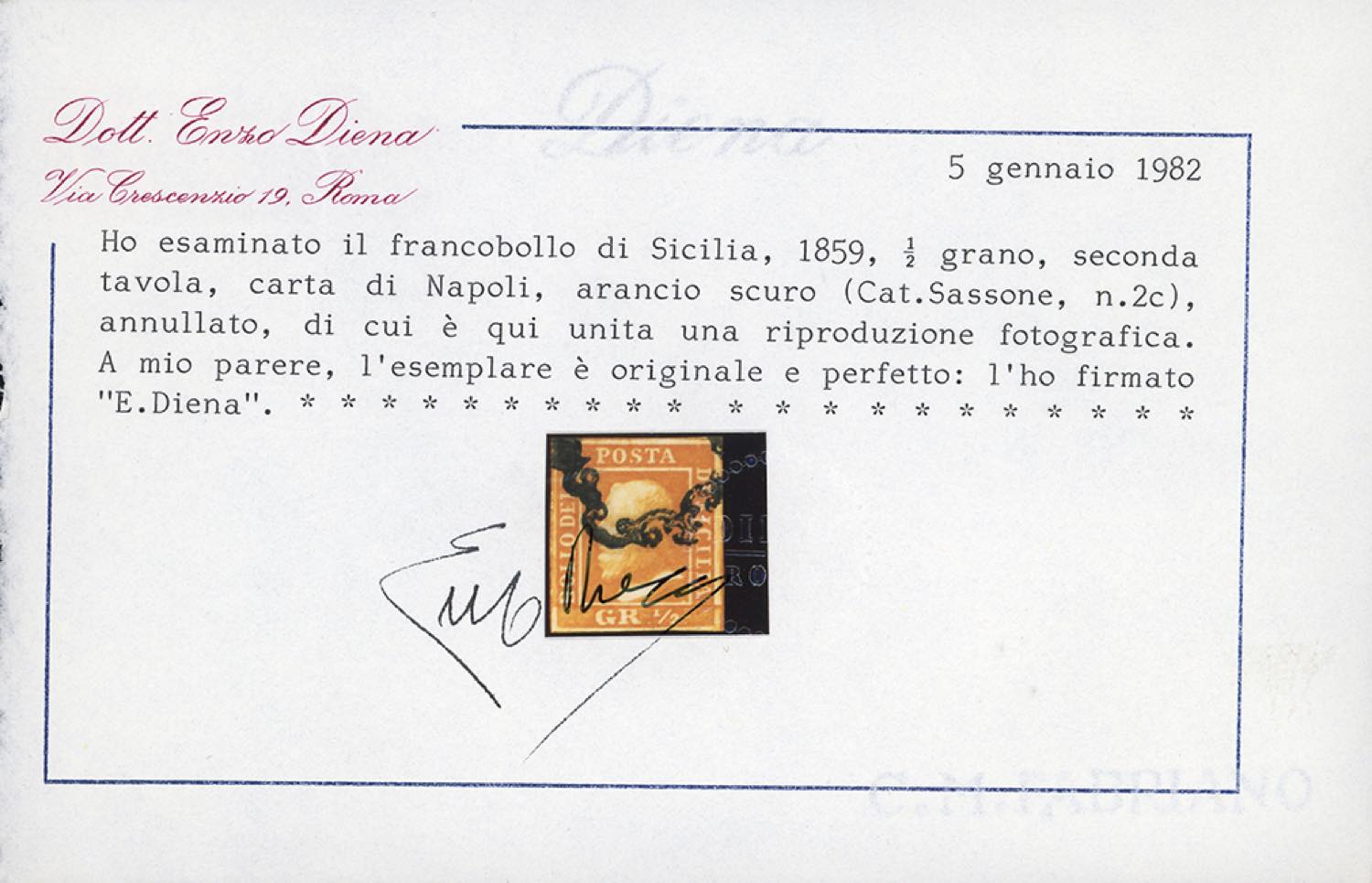 1859 - 1/2 grano arancio scuro, II tavola, carta di Napoli (2c), usato con annullo a ferro di cavallo capovolto ad indicare le "corna" in spregio a Re Ferdinando di Borbone. Molto bello e raro. Chiavarello, Raybaudi, Ferrario, Emilio ed Alberto Diena, cert. E.Diena per esteso. Ex coll. Imperato.