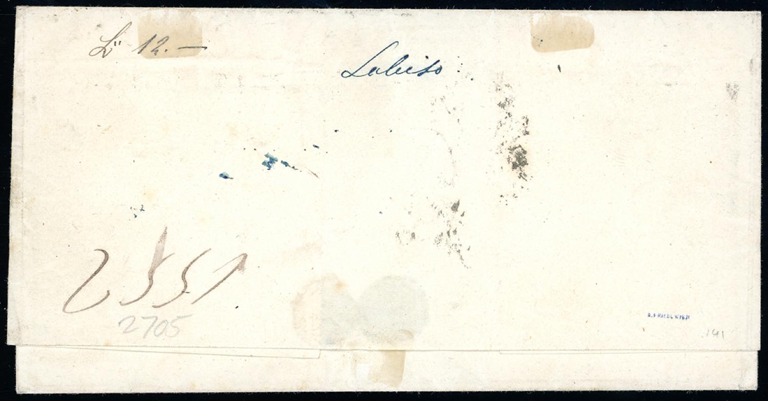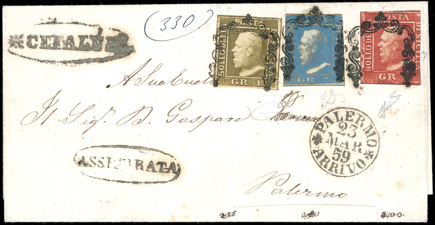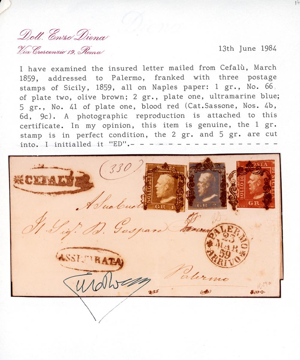 1859 - 2 grana azzurro oltremare, I tavola, STAMPA OLEOSA, 1 grano bruno oliva, II tavola e 5 grana rosso sangue, I tavola (4b,6d,9c), lievi difetti di marginatura, su fresca assicurata da Cefalù a Palermo 23/3/1859. Eccezionale affrancatura. Emilio Diena, cert. E.Diena e Ferrario. Ex coll. Imperato.