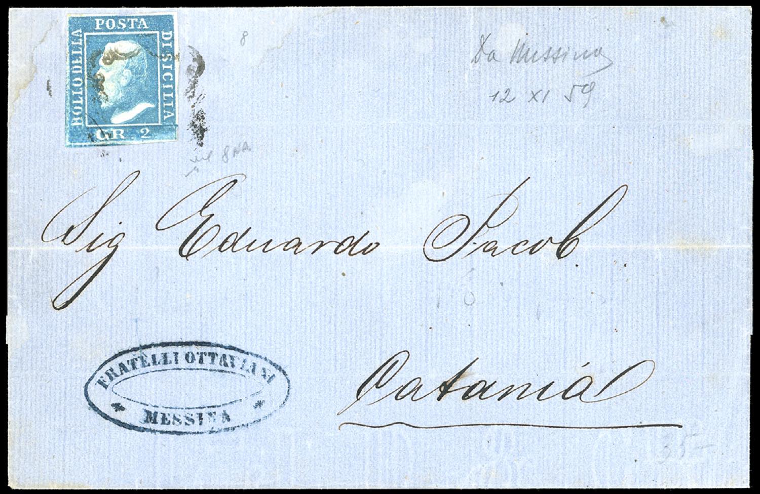 1859 - 2 grana azzurro, III tavola, stampa confusa, carta di Napoli (8), perfetto, su lettera da Messina 12/11/1859 a Catania. Non comune. Chiavarello. Ex coll. Imperato.