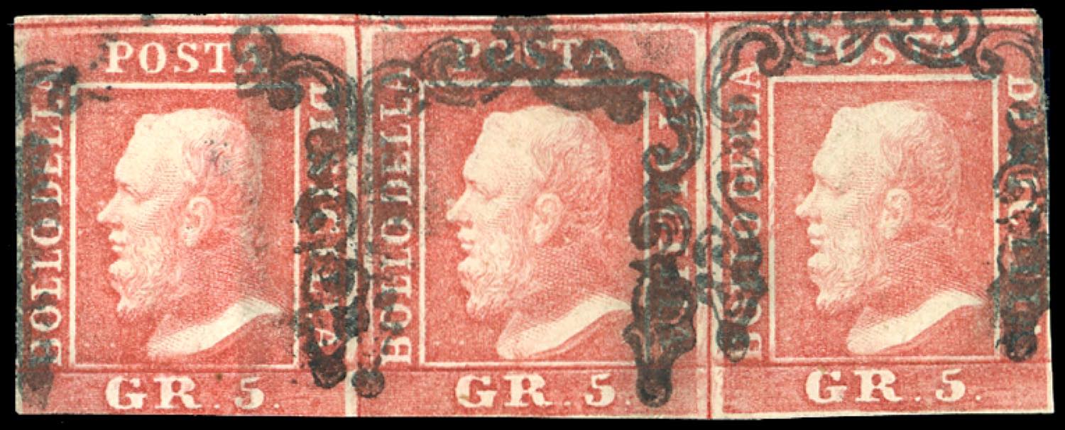 1859 - 5 grana rosa carminio, I tavola (9), striscia orizzontale di tre, posiz. 12, 13, 14, margini appena sfiorati, molto fresca. Cert. Ferrario. Ex coll. Imperato.