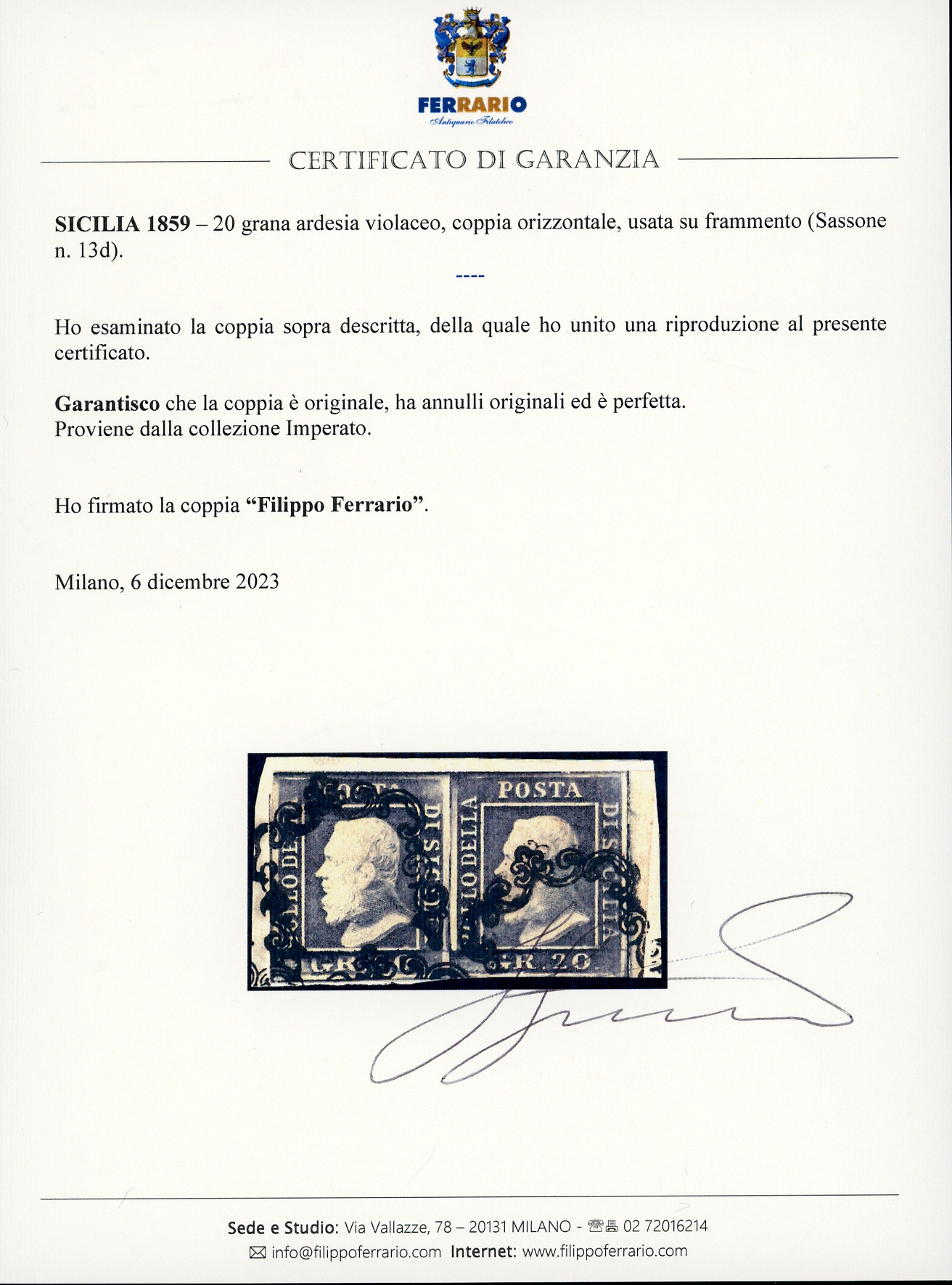 1859 - 20 grana ardesia violaceo (13d), coppia perfetta, usata su frammento. Molto bella. Chiavarello, cert. Ferrario. Ex coll. Imperato.