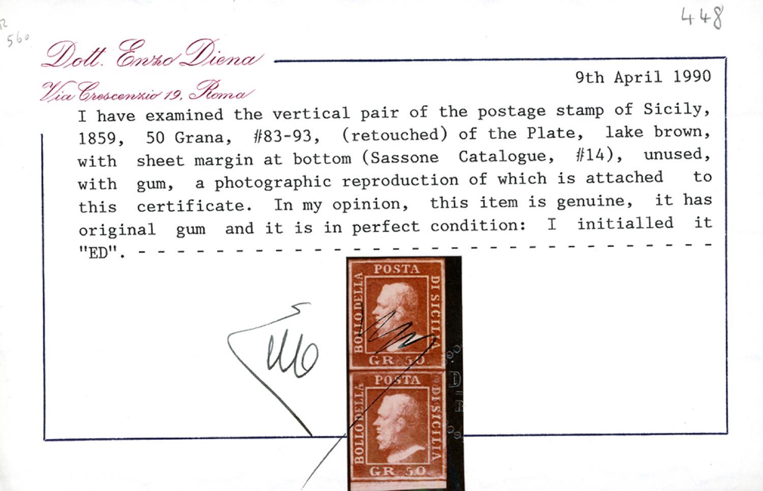 1859 - 50 grana lacca bruno, testa d'avorio, coppia verticale posiz. 83 e 93 con ritocco (14), nuova, gomma originale, integra per l'esemplare ritoccato, margine di foglio inferiore, perfetta. Splendida e rara. Chiavarello, Ferrario, cert. E.Diena. Ex coll. Imperato.