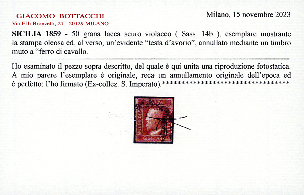 1859 - 50 grana lacca bruno scuro violaceo, stampa oleosa, testa d'avorio (14b), usato, perfetto. Splendido e molto raro. Emilio, Enzo ed Alberto Diena, Chiavarello, cert. Bottacchi e Ferrario. Ex coll. Imperato.