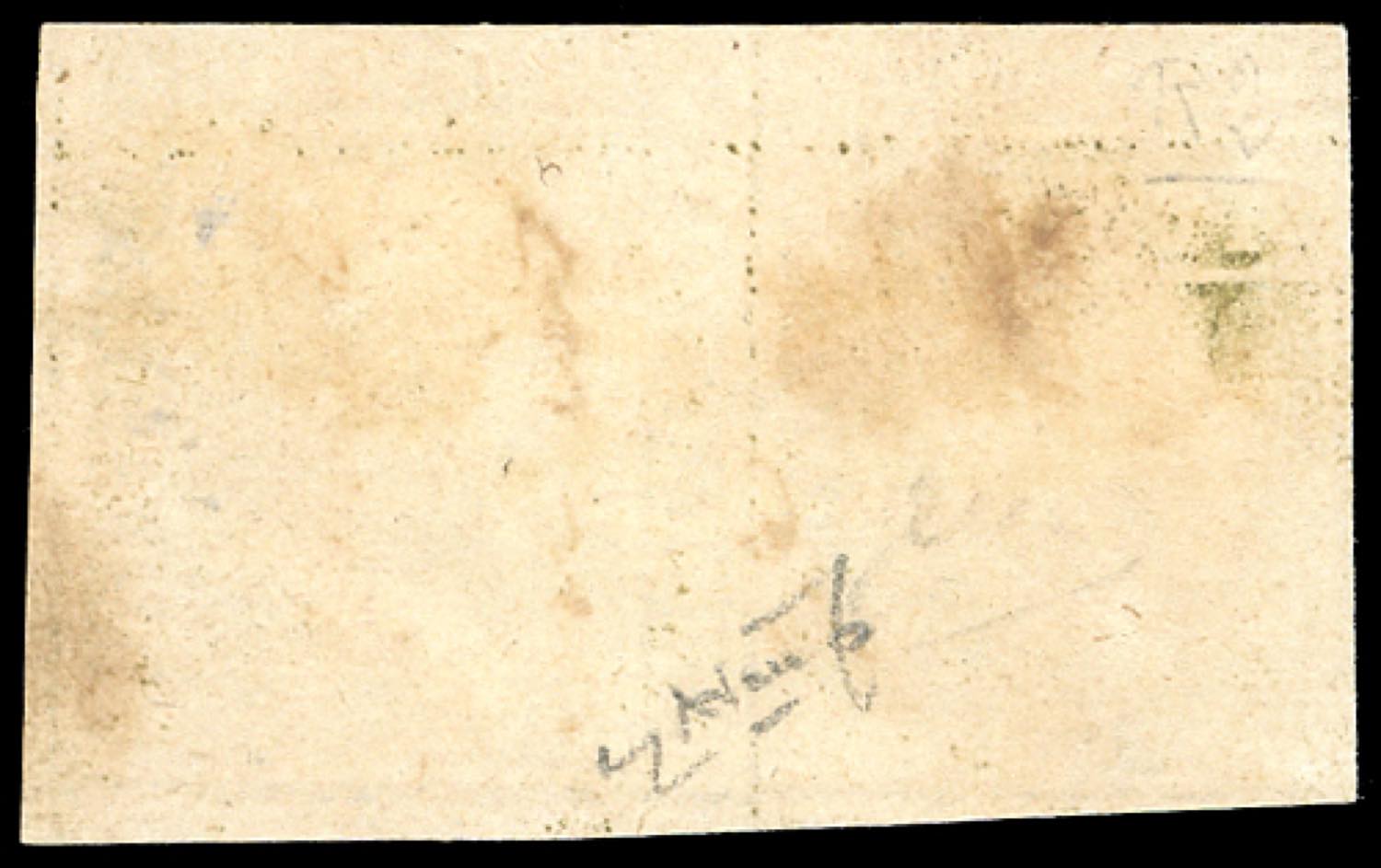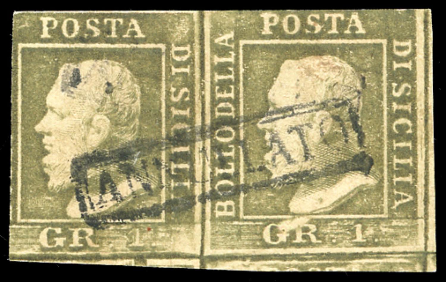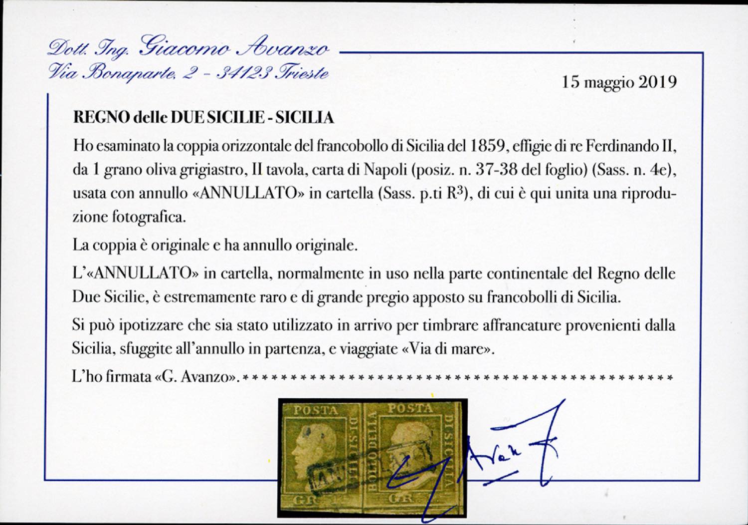 ANNULLATO del Regno di Napoli, punti R3 - 1 grano oliva grigiastro, II tavola, carta di Napoli, pos. 37-38 (4c), coppia orizzontale, bollo in cartella unico annullatore. Rarissimo uso di annullo napoletano sui francobolli di Ferdinando II, utilizzato probabilmente in arrivo su francobolli sfuggiti all'annullo in partenza. INSIEME UNICO. Cert. Avanzo.