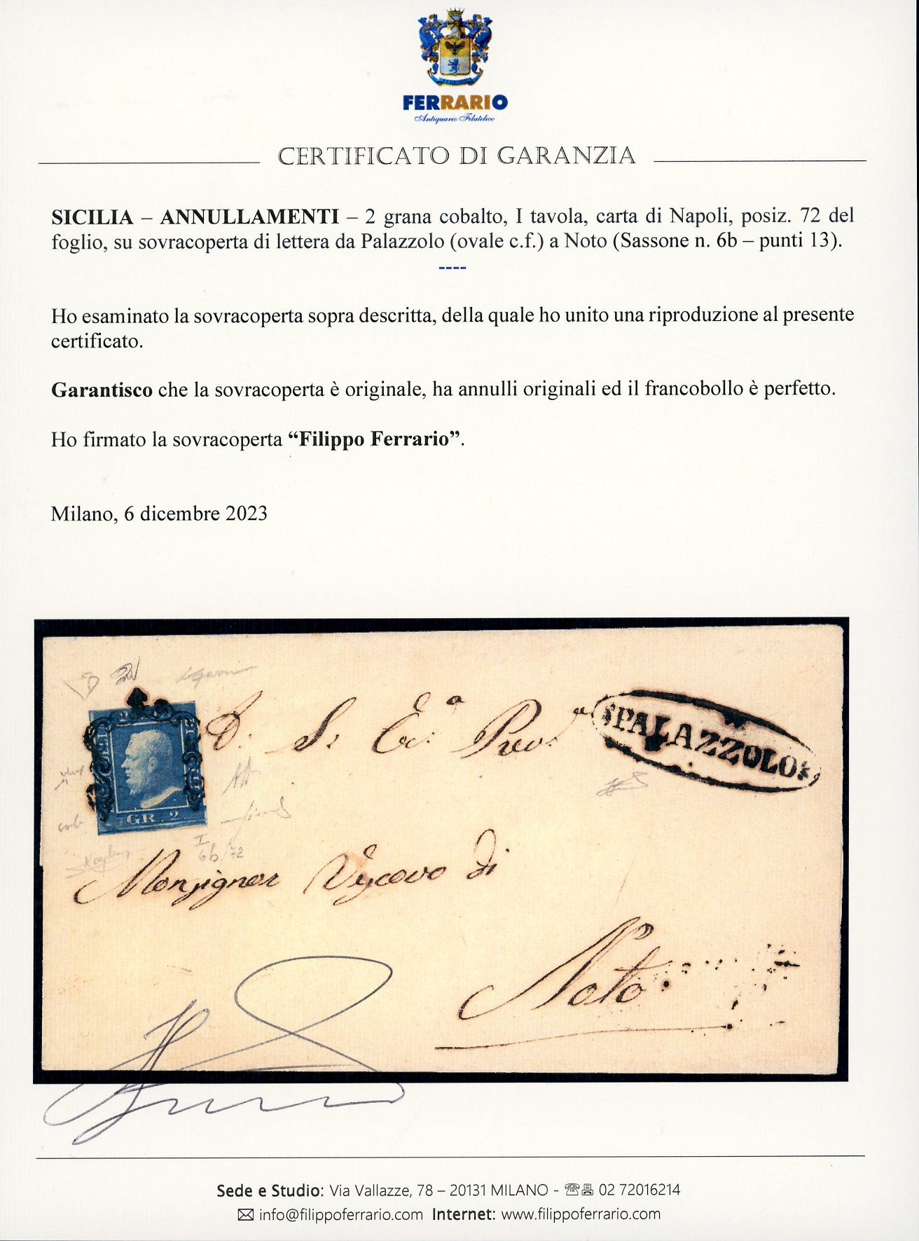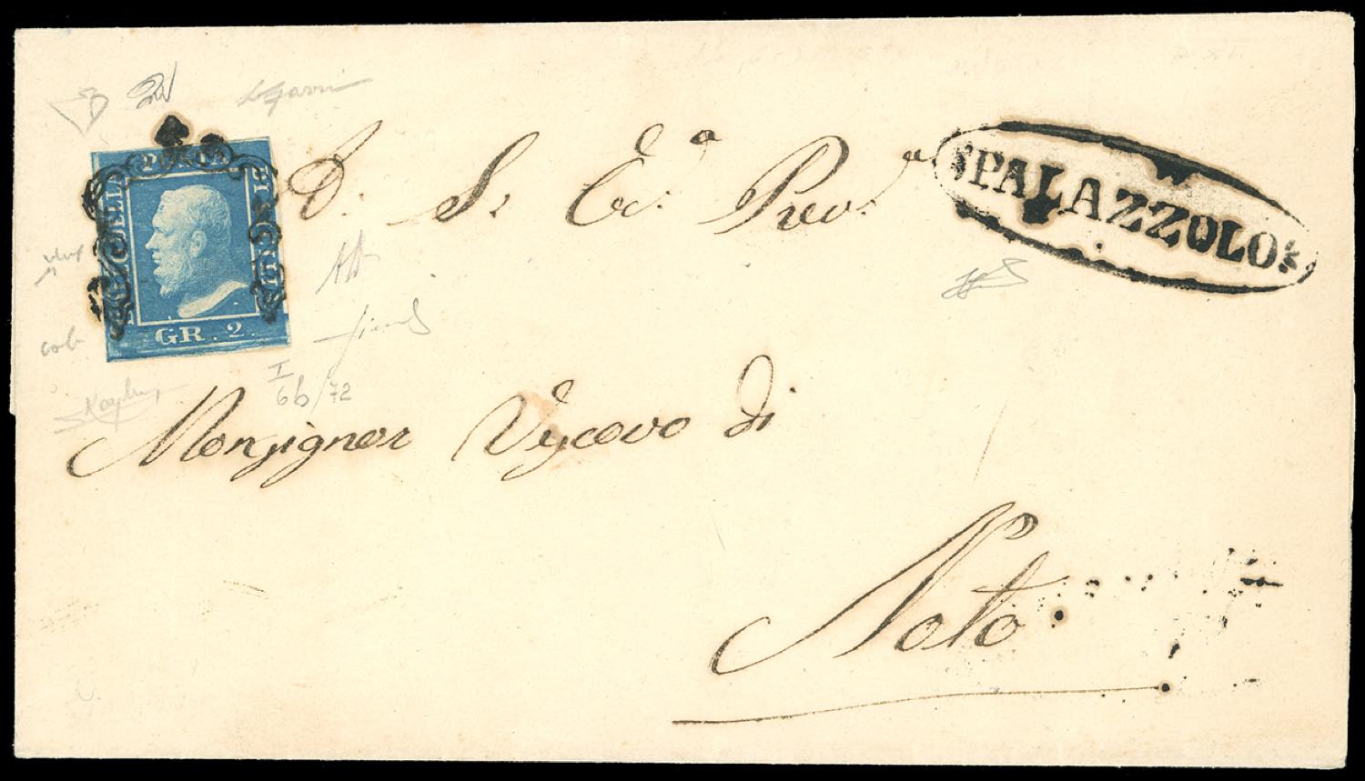 PALAZZOLO, ovale c.f. punti 13 - 2 grana cobalto, I tavola, carta di Napoli, posiz. 72 (6b), perfetto, su fresca sovracoperta di lettera diretta a Noto. Bellissima. Alberto ed Enzo Diena, Raybaudi, Fiecchi, Chiavarello, Luigi Gazzi, cert. Ferrario. Ex coll. Imperato.
