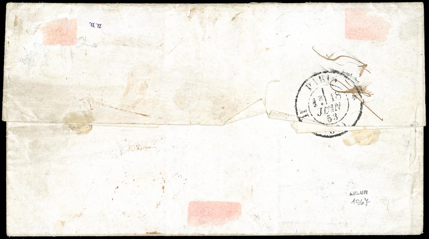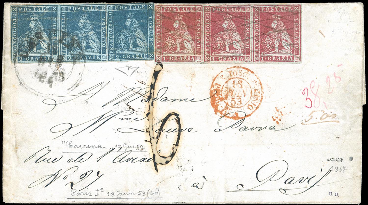 1853 - 1 crazia carminio chiaro, striscia di tre, 2 crazie azzurro chiaro, coppia e singolo (4,5), ottimo stato, su sovracoperta di lettera da Cascina 12/6/1853 (annullo a cerchio e tratti di penna incrociati, entrambi annullatori, non catalogato), bollo d'arrivo a Parigi al verso 18/6/1853. Rara affrancatura multipla per ottemperare al primo porto di 9 crazie, tassata 6 in arrivo. INSIEME UNICO sia per l'affrancatura che per la tipologia d'annullamento. Cert. E.Diena.
