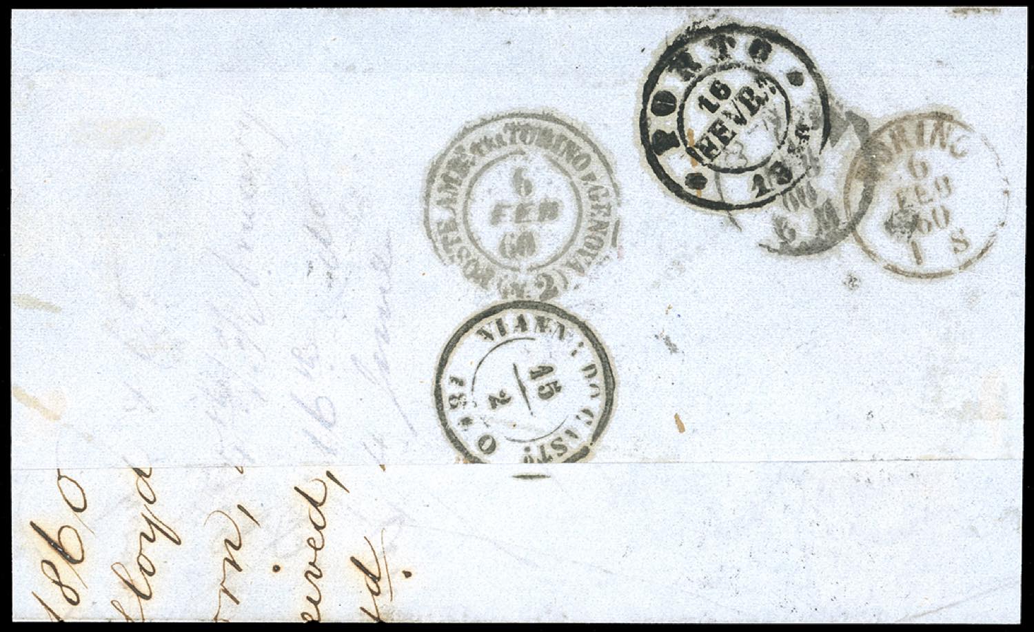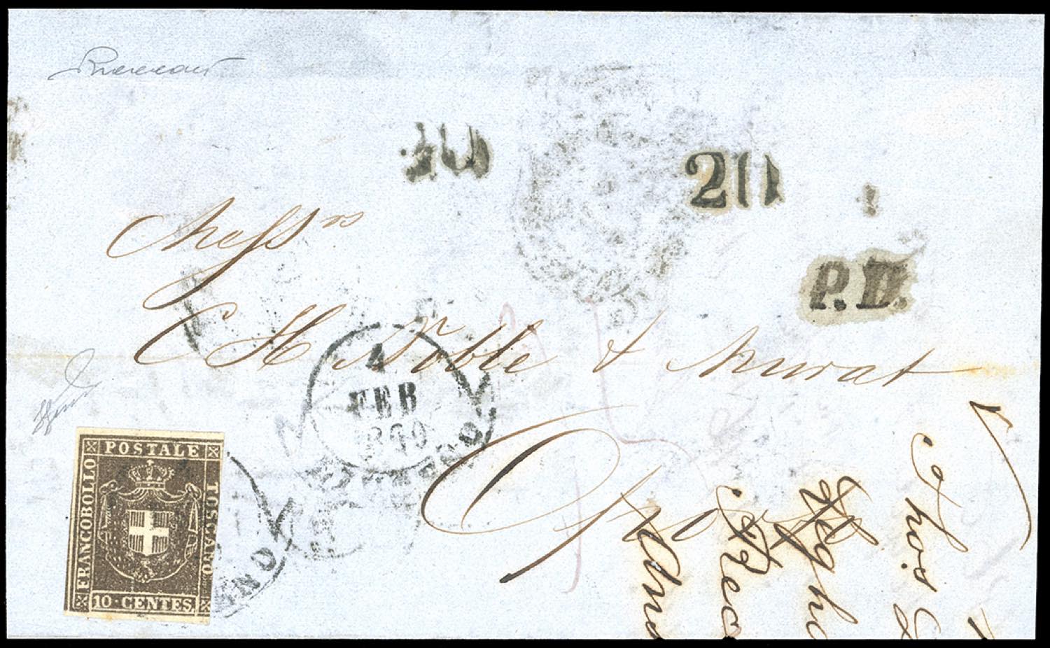 1860 - 10 cent. bruno (19), tre ottimi margini, corto a destra, isolato su circolare da Livorno 4/2/1860 ad Oporto, bollo P.D., tassata in arrivo 20 r. RARISSIMA CIRCOLARE PER L'ESTERO, UNA DELLE TRE SOLE NOTE dal Governo Provvisorio al Portogallo. Vaccari, cert. Ferrario. Ex coll. Imperato.