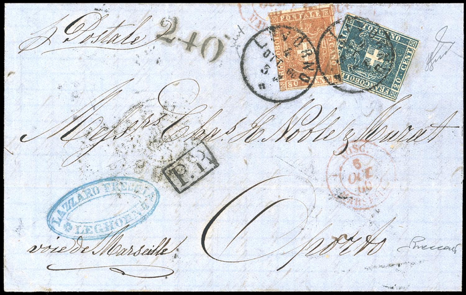 1860 - 80 cent. carnicino e 20 cent. azzurro (22,20), su lettera da Livorno 4/10/1860 ad Oporto, via di Marsiglia, bollo di tassa 240 r. Molto rare le lettere dal Governo Provvisorio al Portogallo. Vaccari, Chiavarello, cert. Ferrario. Ex coll. Imperato.