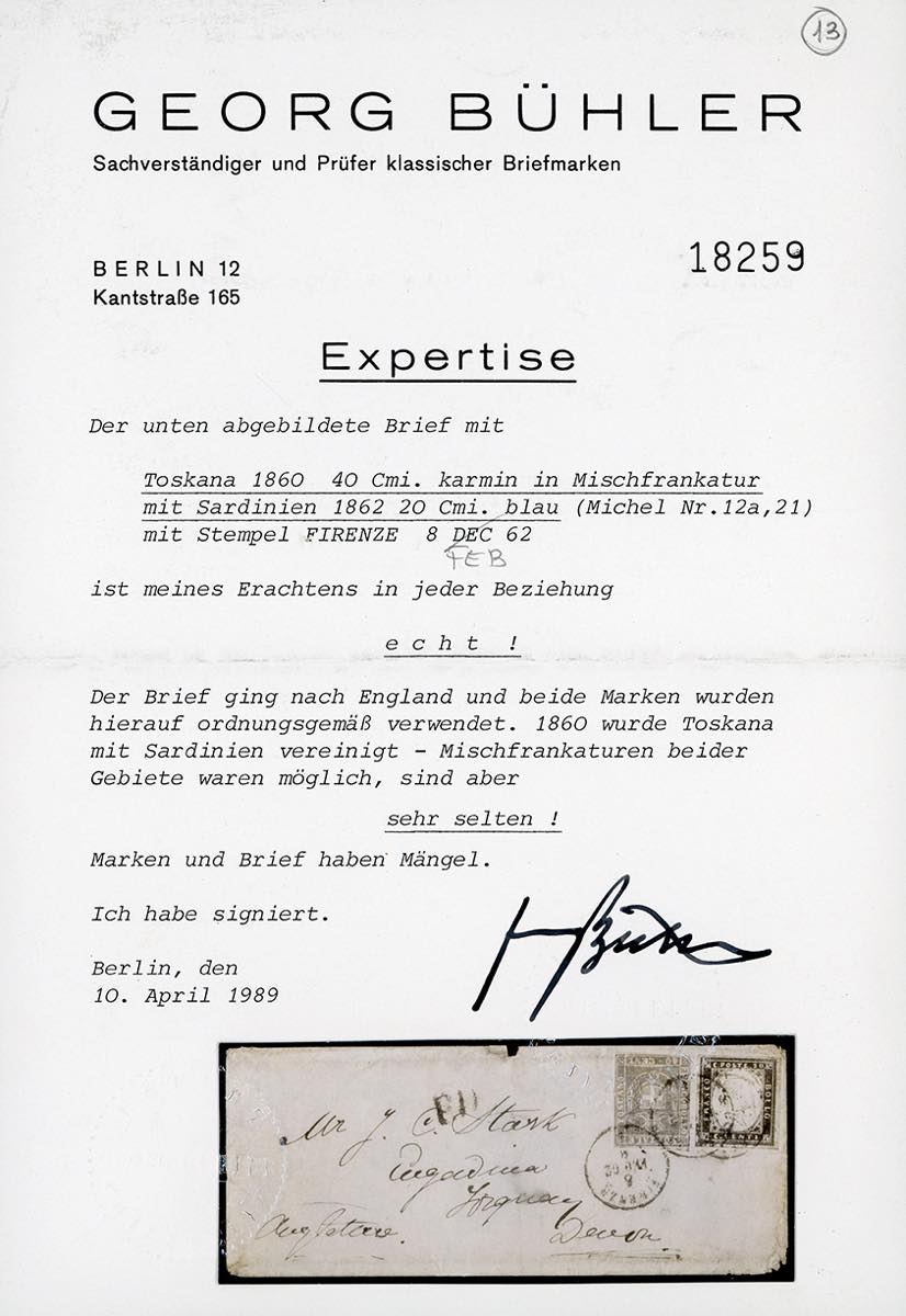 1862 - 40 cent. carminio (21), in affrancatura mista con 20 cent. IV emisisone di Sardegna (15C), lievi difetti di marginatura, su piccola busta da Firenze 6/2/1862 per l'Inghilterra. Rara. Cert. Buhler.