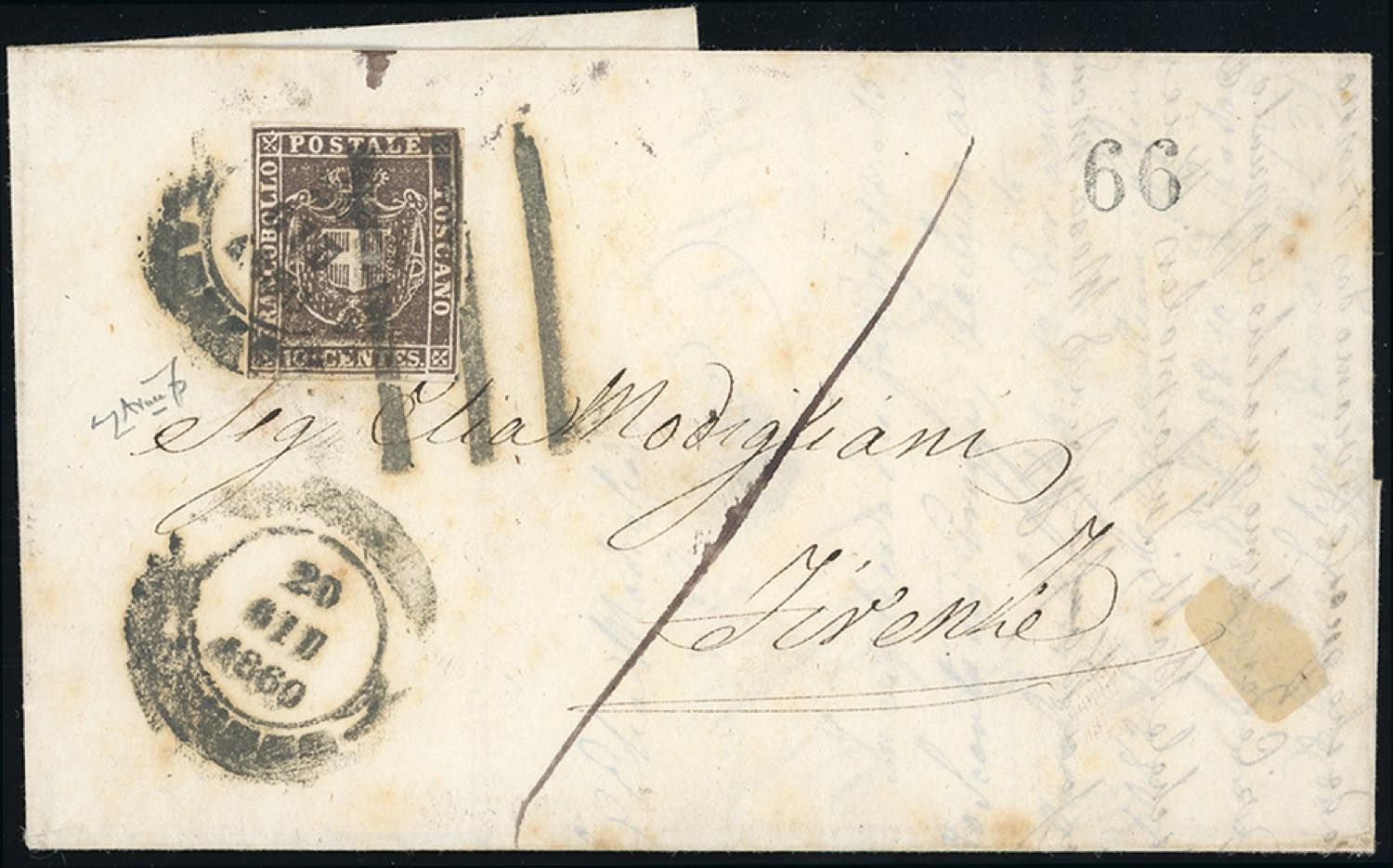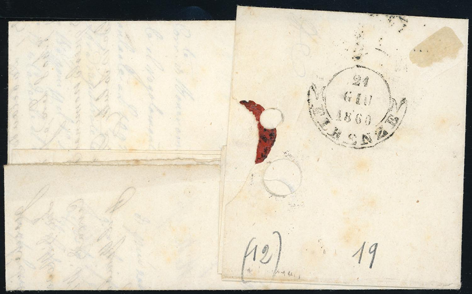 AREZZO, cerchio a banderuola II tipo + muto a tre sbarre spesse e corte coannullatori punti 12 - 10 cent. (19), due margini giusti, su lettera del 20/6/1860 per Firenze. Combinazione di annulli ad oggi inedita, unica nota! Cert. Avanzo.