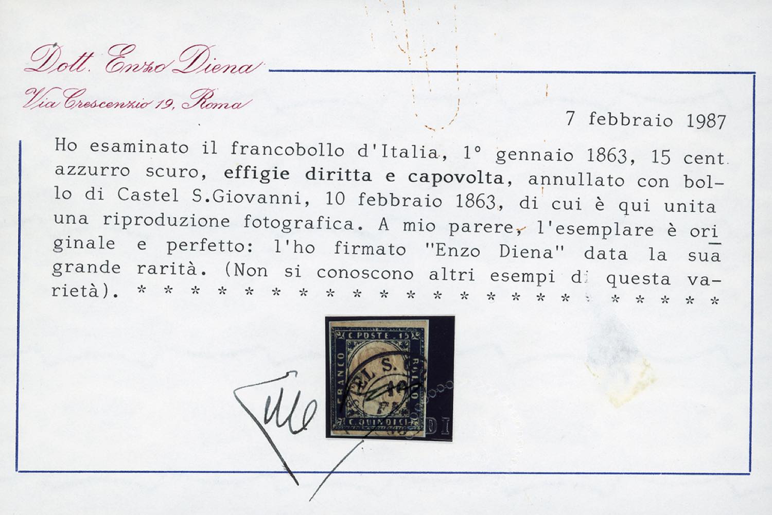 1863 - 15 cent. azzurro scuro, doppia effigie di cui una capovolta (11lb), perfetto, usato a Castel S.Giovanni 10/2/1863. Si tratta dell'UNICO ESEMPLARE NOTO di questa varietà, citato dal catalogo Sassone. Raybaudi, cert. E.Diena.