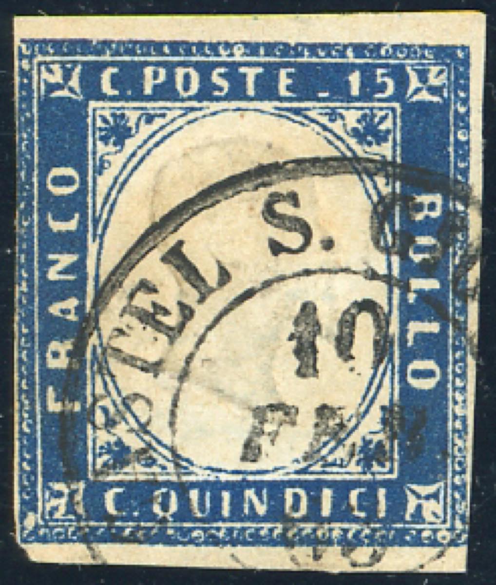 1863 - 15 cent. azzurro scuro, doppia effigie di cui una capovolta (11lb), perfetto, usato a Castel S.Giovanni 10/2/1863. Si tratta ... Leggi tutto