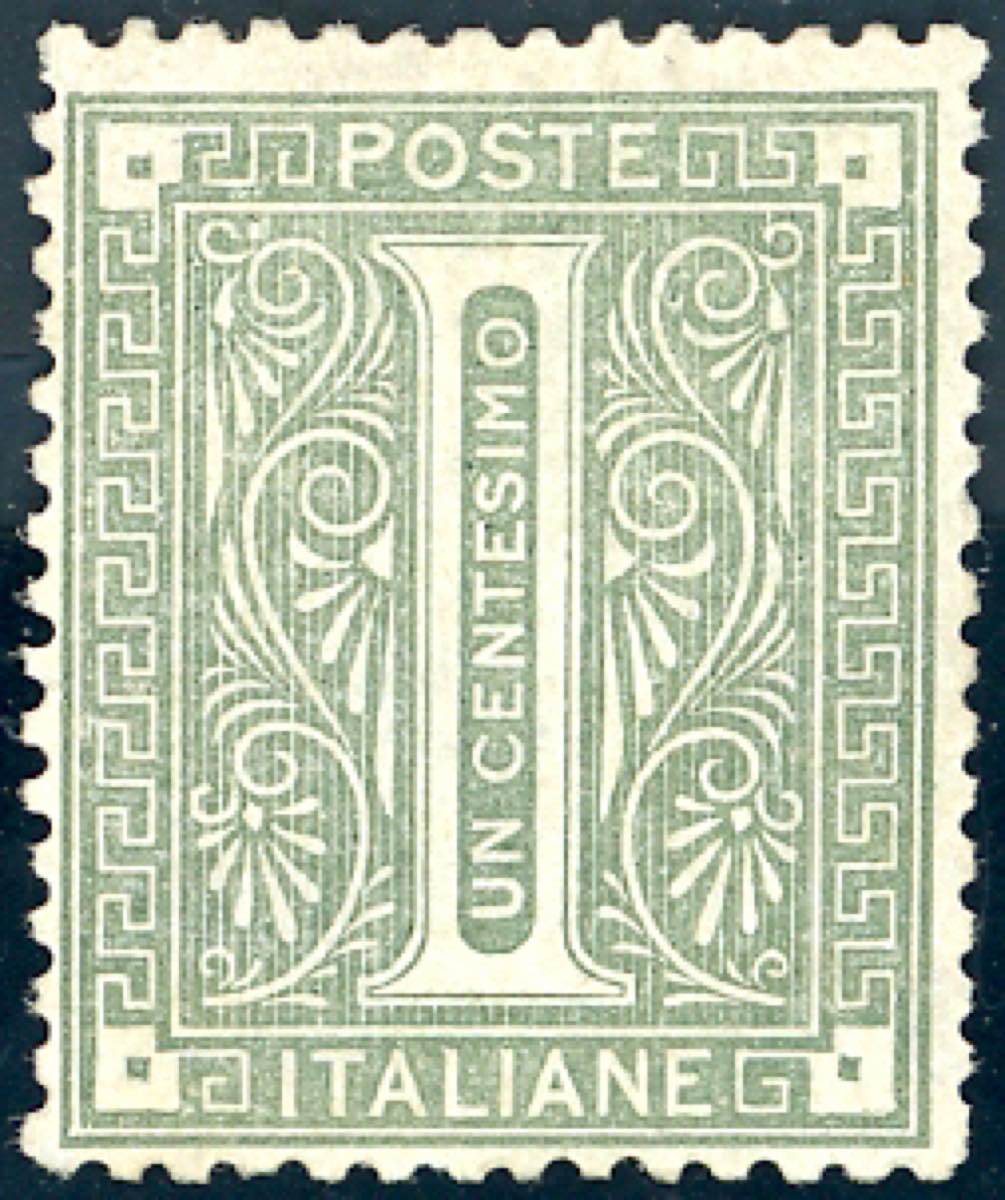 1874 - 1 cent. verde oliva De La Rue, ANGOLI MODIFICATI per l'emissione del Levante, SENZA SOPRASTAMPA (T14A), gomma originale integra, perfetto e molto ben centrato. UNO DEI MIGLIORI ESEMPLARI NOTI DI QUESTO RARISSIMO FRANCOBOLLO, di cui si conoscono pochissimi esemplari. Emilio ed Alberto Diena, cert. Ferrario, Avi e Diena.