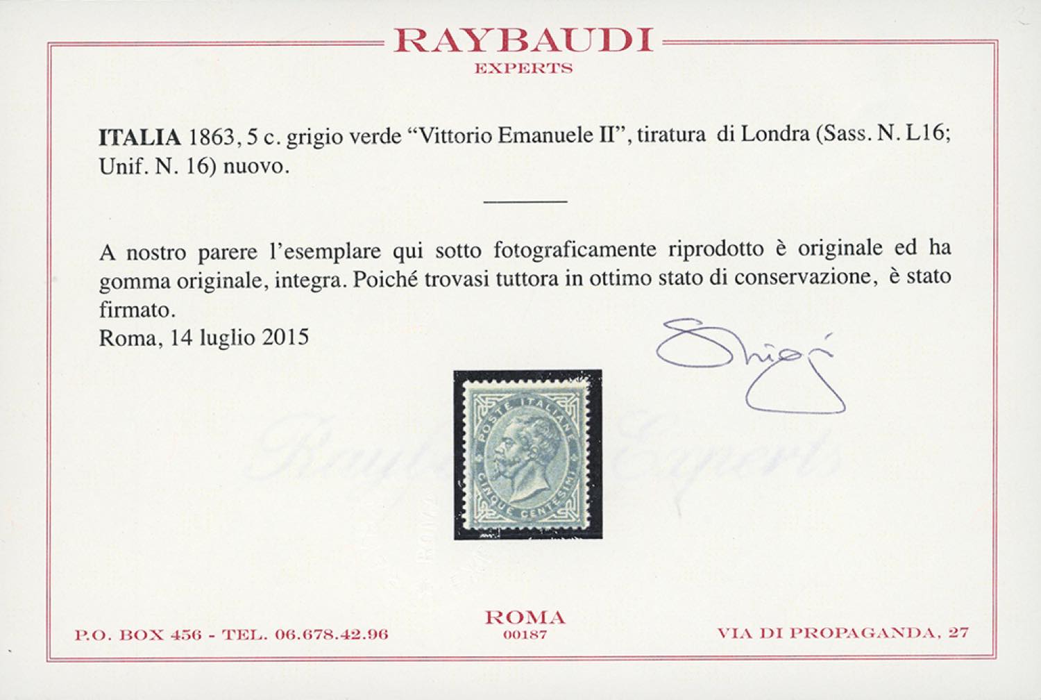 1863 - 5 cent. De La Rue, tiratura di Londra (L16), discreta centratura, gomma originale integra, perfetto e molto fresco. Cert. Raybaudi.