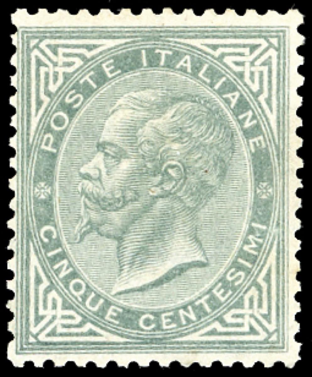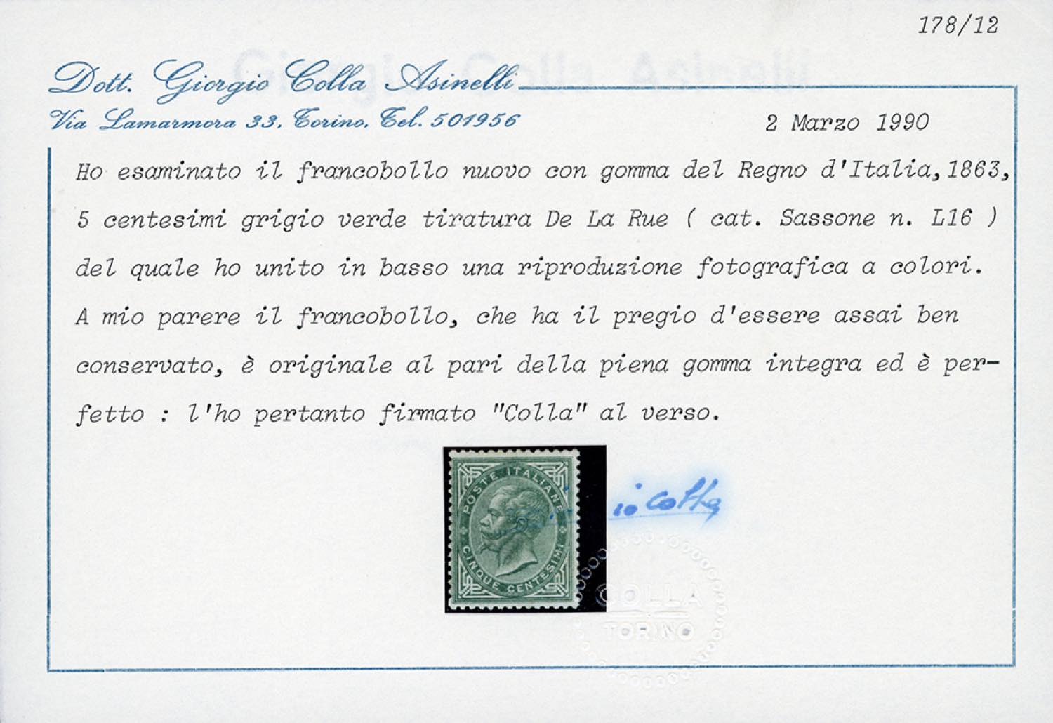 1863 - 5 cent. grigio verde, De La Rue, tiratura di Londra (L16), nuovo, gomma originale integra, perfetto. Freschissimo e ben centrato. Cert. Ferrario e Colla.