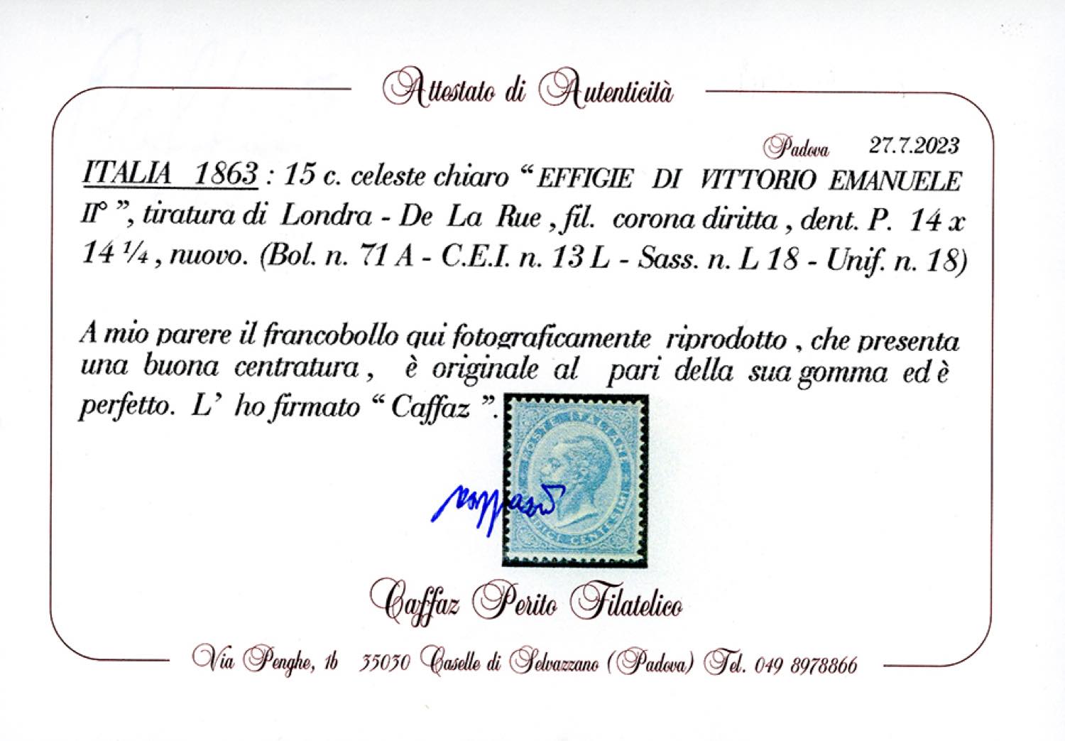 Lotto 748 - 1863 - 15 cent. De La Rue, tiratura di Londra (L18), ottima ...