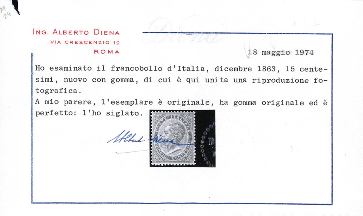1863 - 15 cent. De La Rue, tiratura di Londra (L18), ottima centratura, gomma originale, impercettibile traccia di linguella, perfetto e molto fresco. Ottima qualità. Cert.A.Diena e Caffaz.